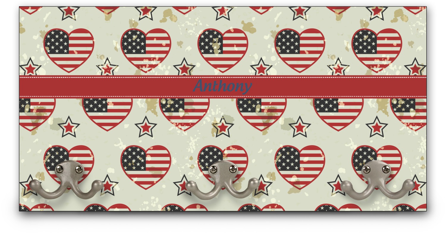 This coat rack is the perfect way to add some personality to your wall or entryway. The board is made of a strong maple that is approximately 16" x 8". The three 2-prong hooks are a sturdy metal that have three screws attaching them to the board. Your design is printed right onto the front of the board while the back and sides are a simple black.