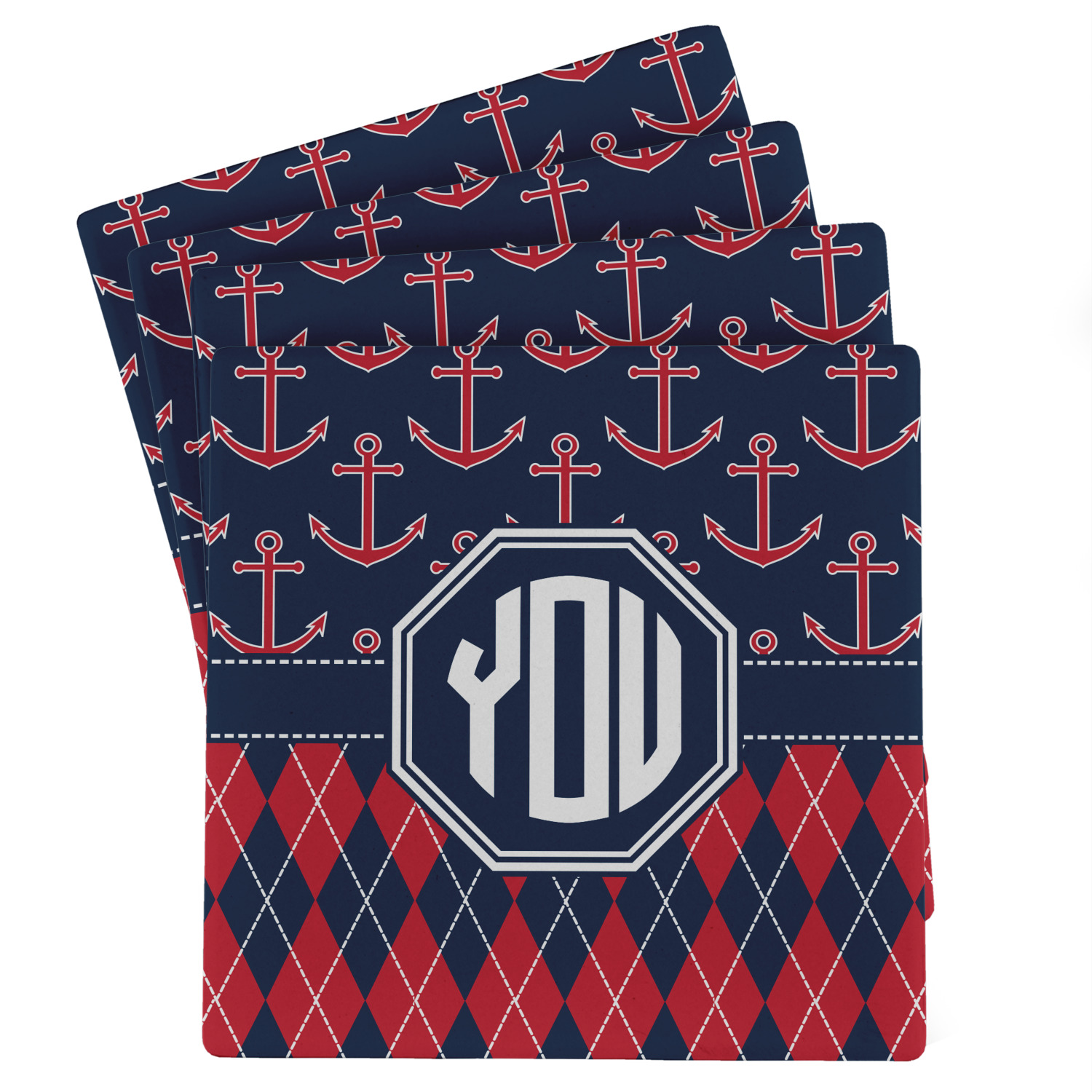 Come sail away with our Anchors & Argyle design. This design is a great balance of sea and land with nautical, red anchors on navy background and preppy red and navy argyle. Our design shown in bold navy and red, but the colors can be customized.