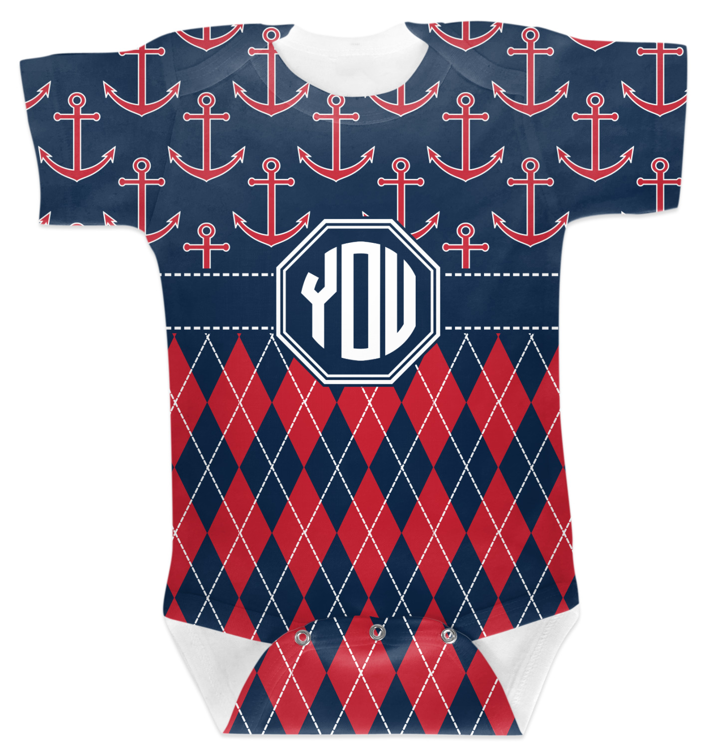 Come sail away with our Anchors & Argyle design. This design is a great balance of sea and land with nautical, red anchors on navy background and preppy red and navy argyle. Our design shown in bold navy and red, but the colors can be customized.