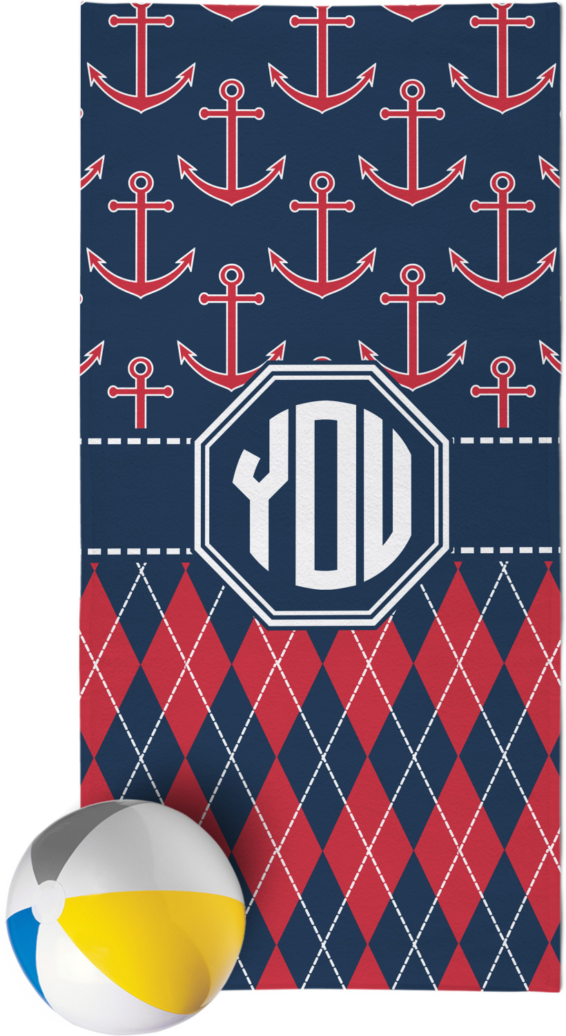 Come sail away with our Anchors & Argyle design. This design is a great balance of sea and land with nautical, red anchors on navy background and preppy red and navy argyle. Our design shown in bold navy and red, but the colors can be customized.