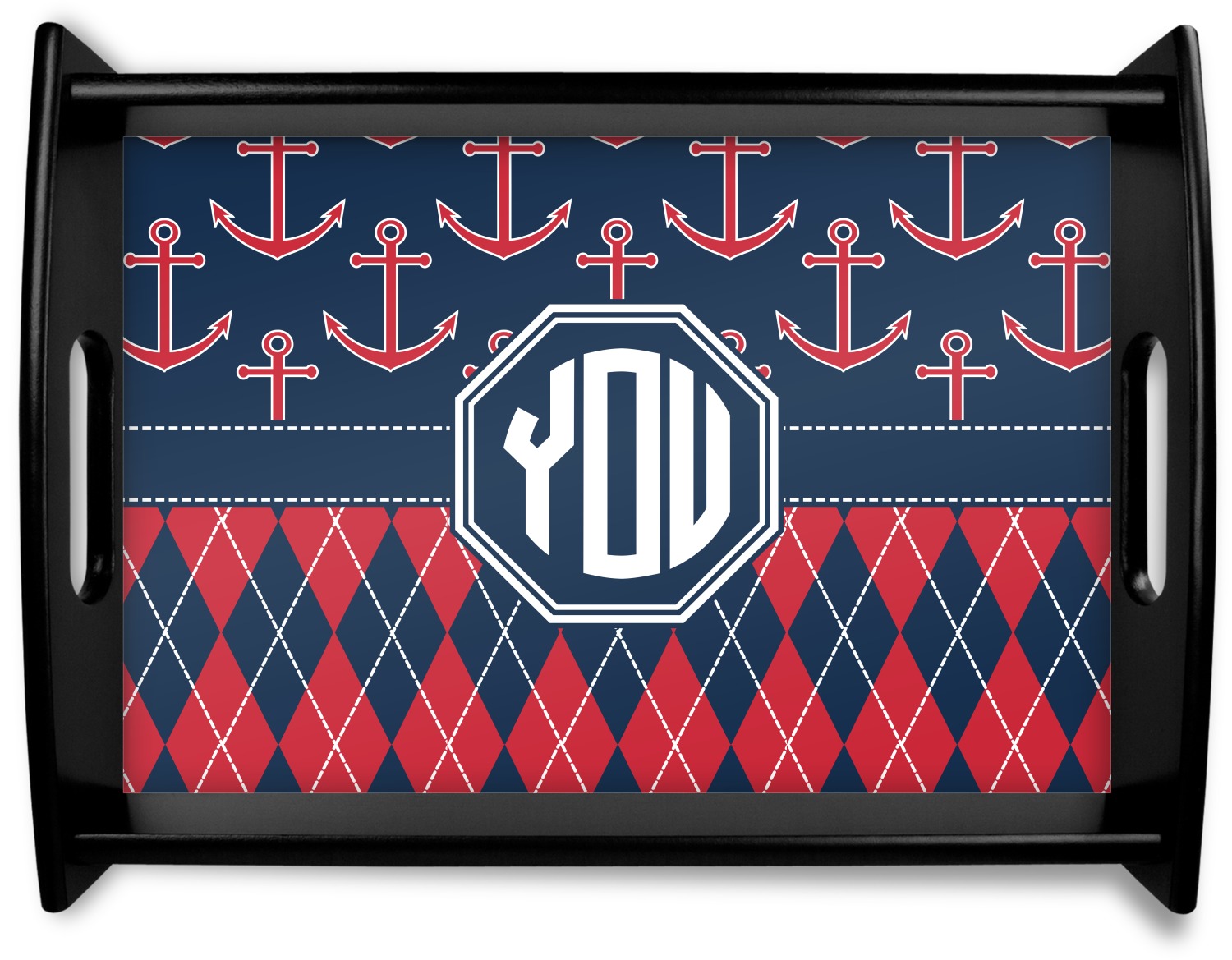Come sail away with our Anchors & Argyle design. This design is a great balance of sea and land with nautical, red anchors on navy background and preppy red and navy argyle. Our design shown in bold navy and red, but the colors can be customized.