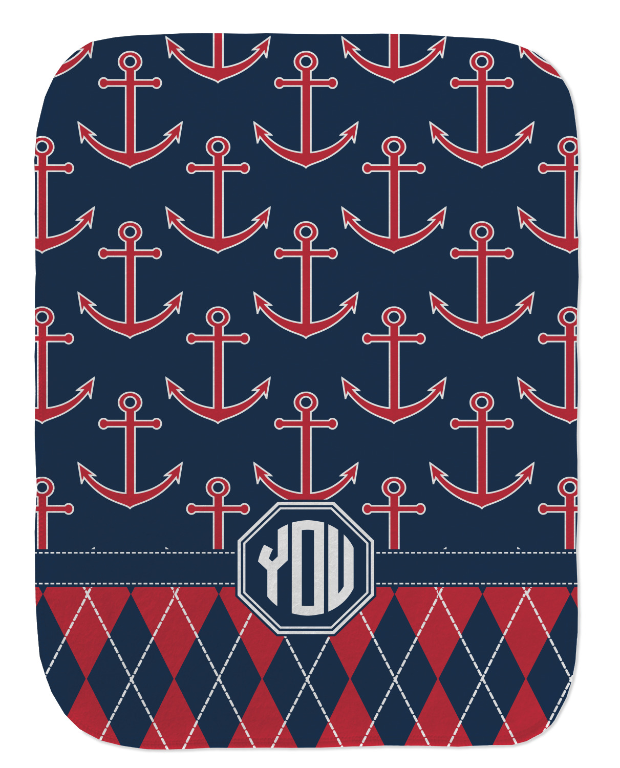 Come sail away with our Anchors & Argyle design. This design is a great balance of sea and land with nautical, red anchors on navy background and preppy red and navy argyle. Our design shown in bold navy and red, but the colors can be customized.