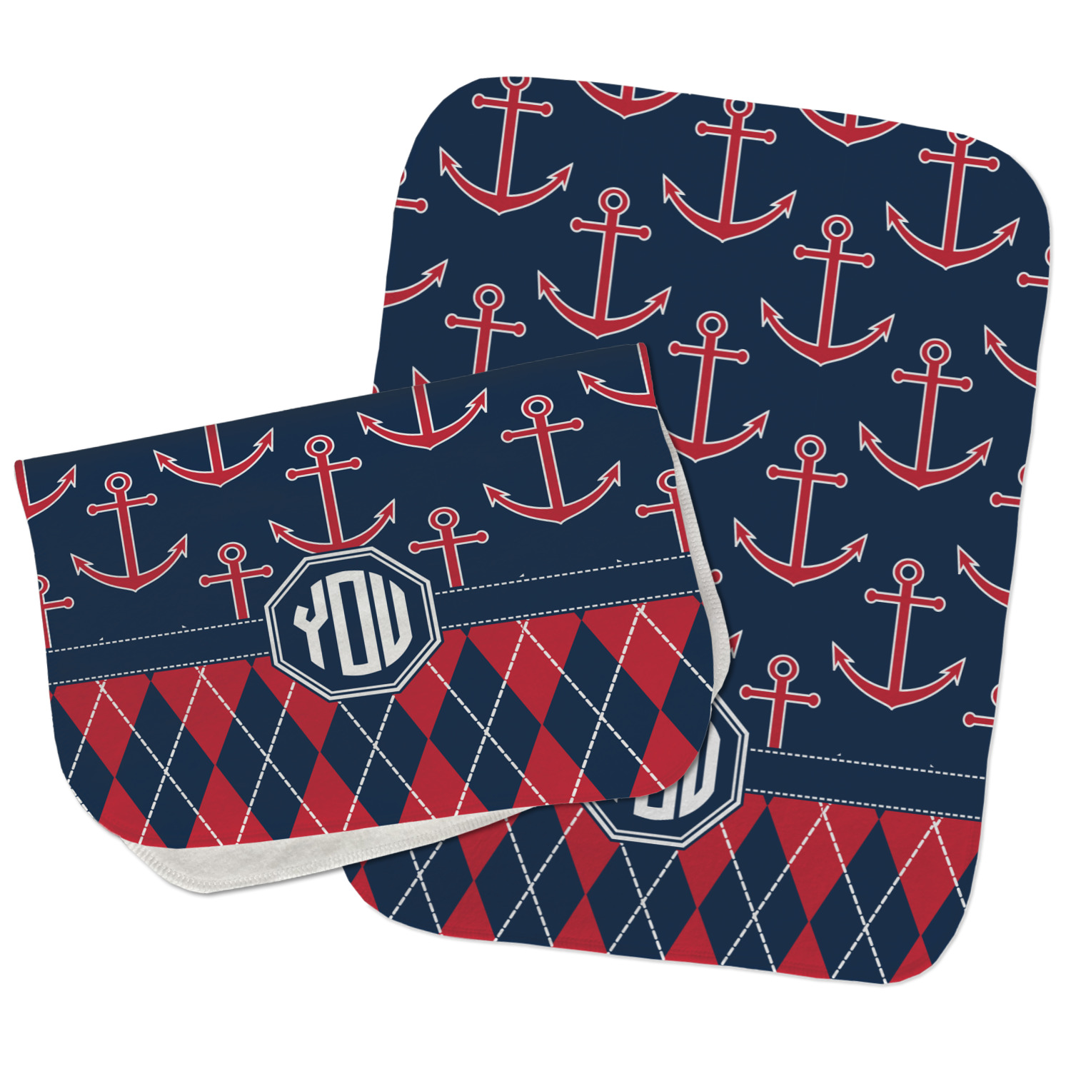 Come sail away with our Anchors & Argyle design. This design is a great balance of sea and land with nautical, red anchors on navy background and preppy red and navy argyle. Our design shown in bold navy and red, but the colors can be customized.