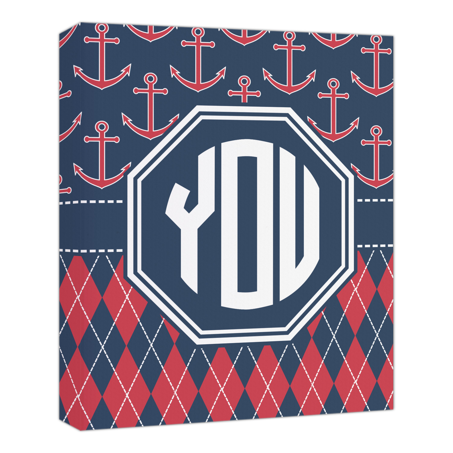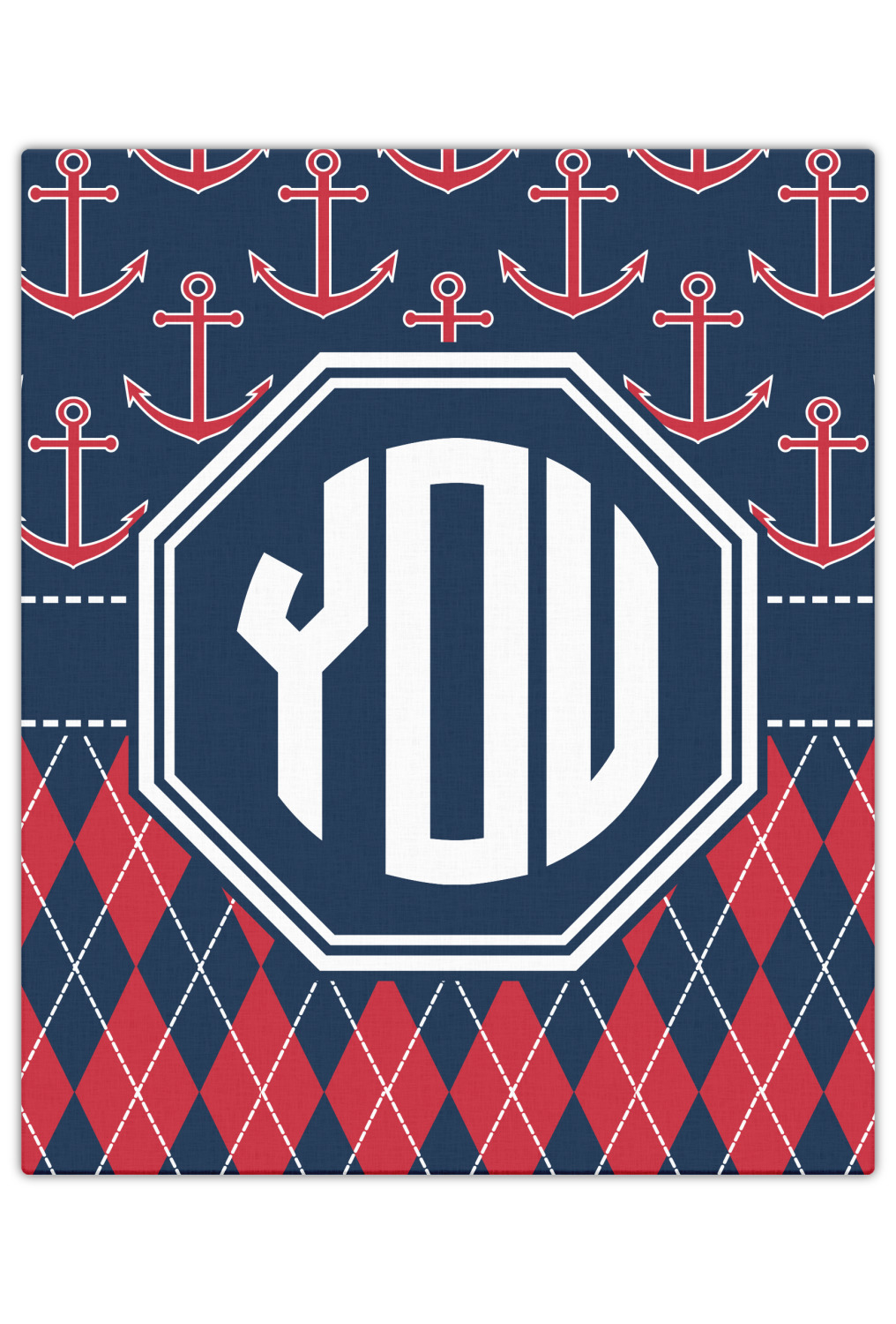 Come sail away with our Anchors & Argyle design. This design is a great balance of sea and land with nautical, red anchors on navy background and preppy red and navy argyle. Our design shown in bold navy and red, but the colors can be customized.