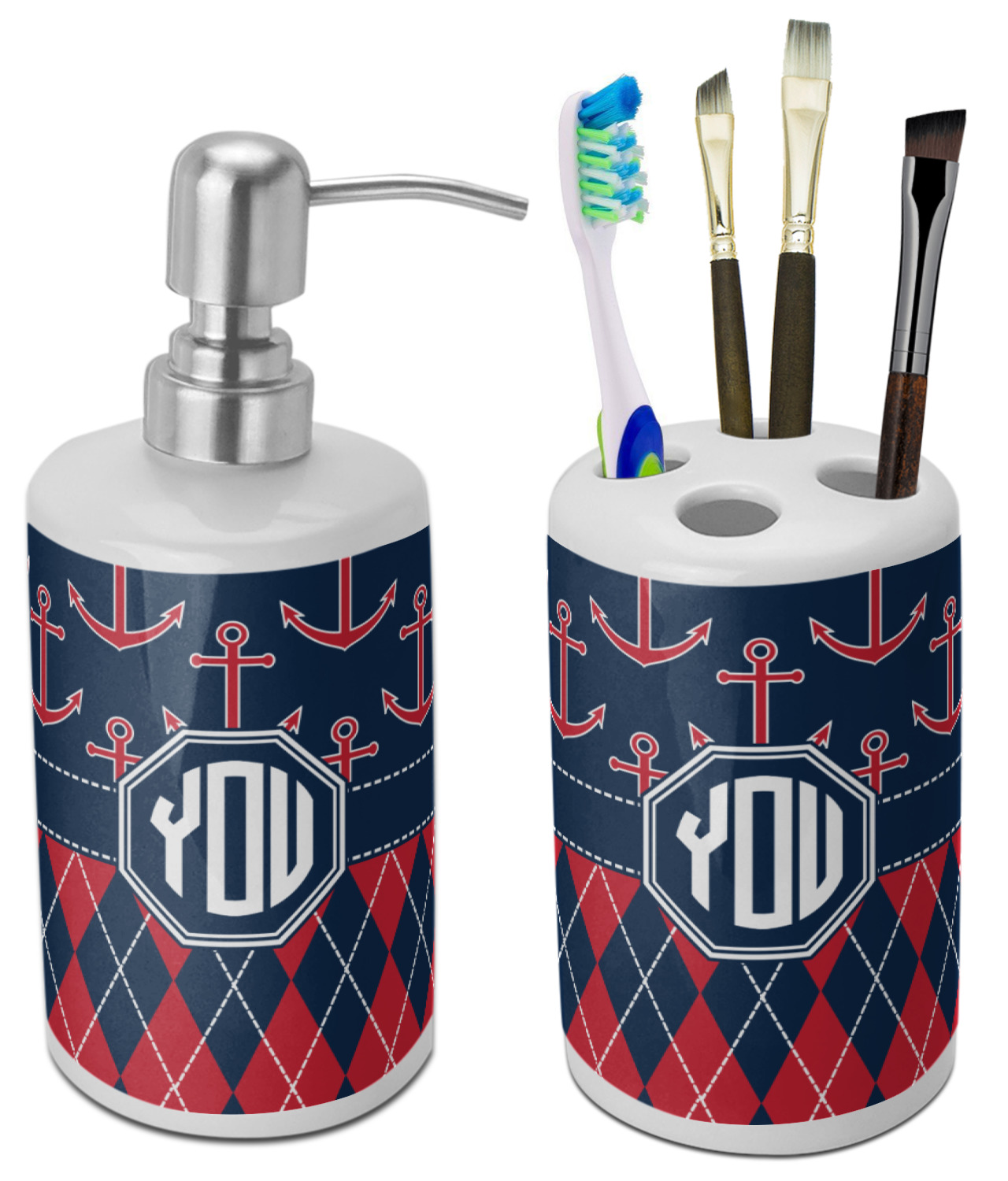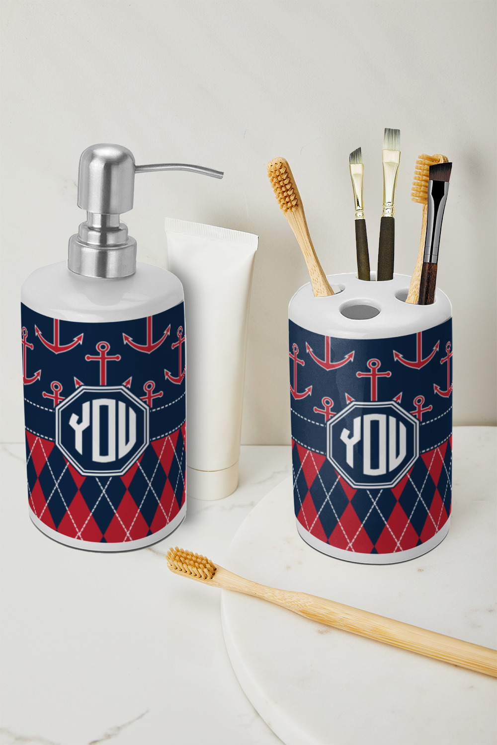 Come sail away with our Anchors & Argyle design. This design is a great balance of sea and land with nautical, red anchors on navy background and preppy red and navy argyle. Our design shown in bold navy and red, but the colors can be customized.