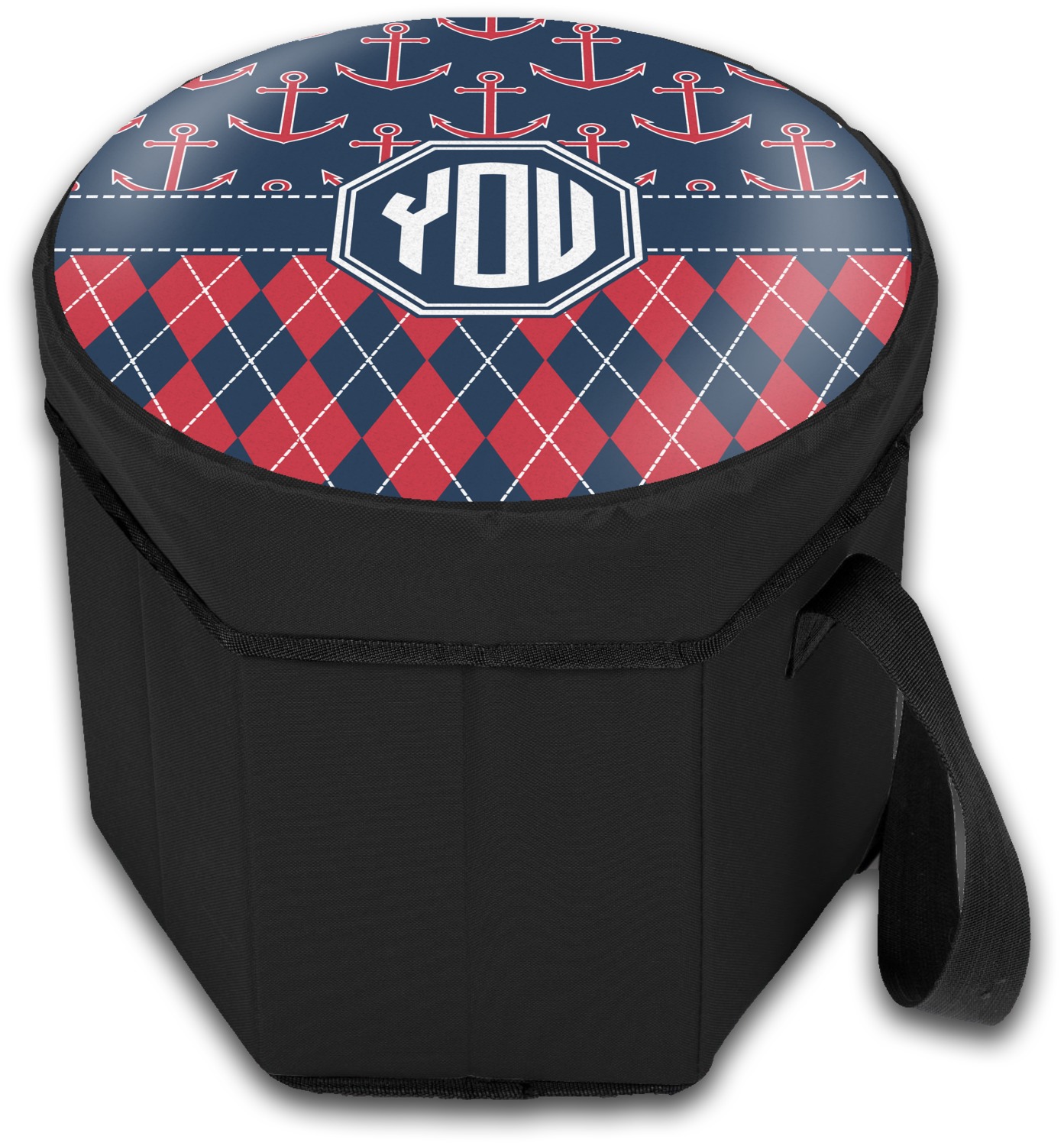 Our collapsible insulated coolers feature a unique six-sided hexagon shape, are lightweight, durable and can be turned into a seat. This cooler is fully insulated with silver foil lining to keep food and drinks hot or cold, and has a 12-quart capacity. Although this cooler collapses for easy transport, hidden inside are composition panels made of sturdy wood that give the frame strength and allow this cooler to be used as a seat. Simply sit down on the personalized cover and give your legs a break! (Maximum weight capacity of 200 pounds.)