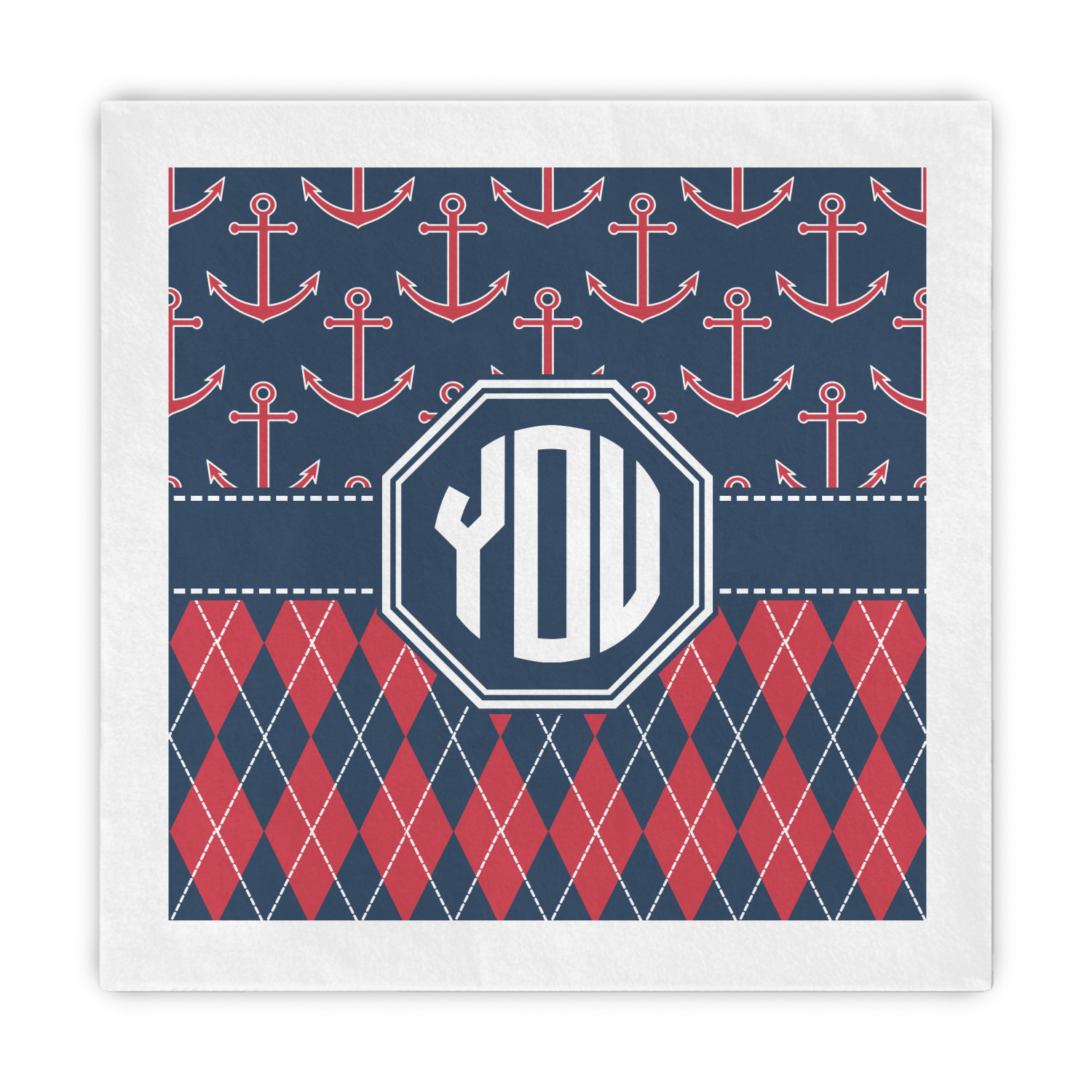 Come sail away with our Anchors & Argyle design. This design is a great balance of sea and land with nautical, red anchors on navy background and preppy red and navy argyle. Our design shown in bold navy and red, but the colors can be customized.
