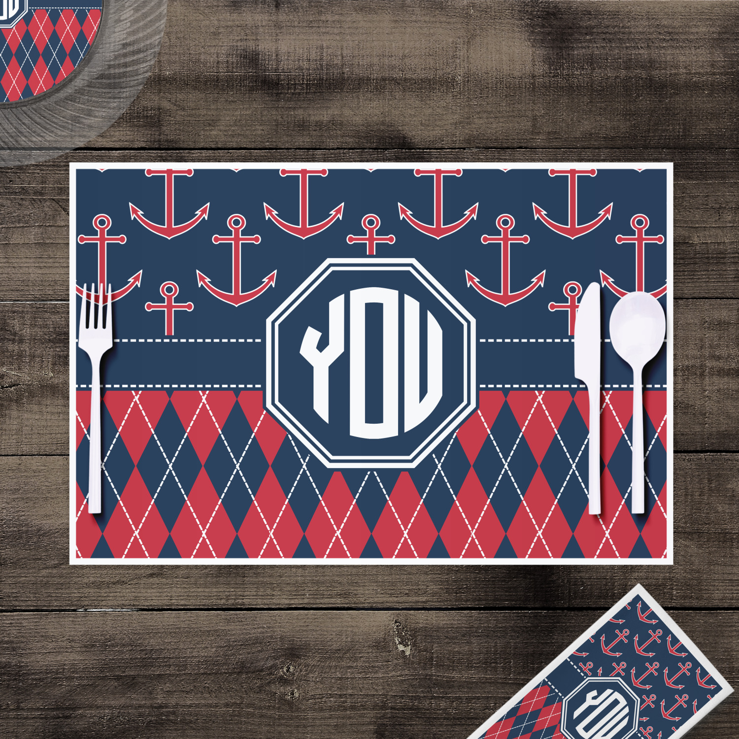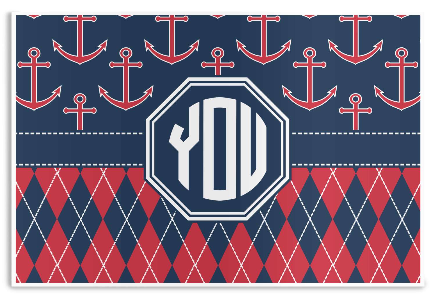 Come sail away with our Anchors & Argyle design. This design is a great balance of sea and land with nautical, red anchors on navy background and preppy red and navy argyle. Our design shown in bold navy and red, but the colors can be customized.
