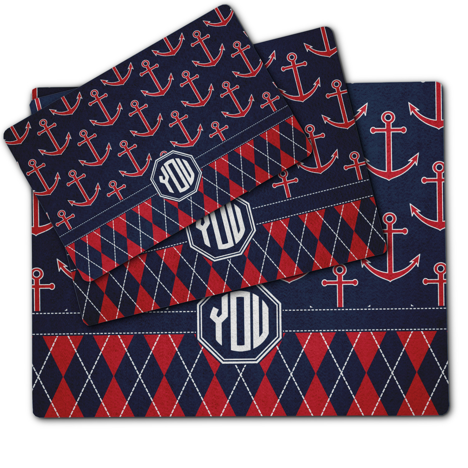 Come sail away with our Anchors & Argyle design. This design is a great balance of sea and land with nautical, red anchors on navy background and preppy red and navy argyle. Our design shown in bold navy and red, but the colors can be customized.