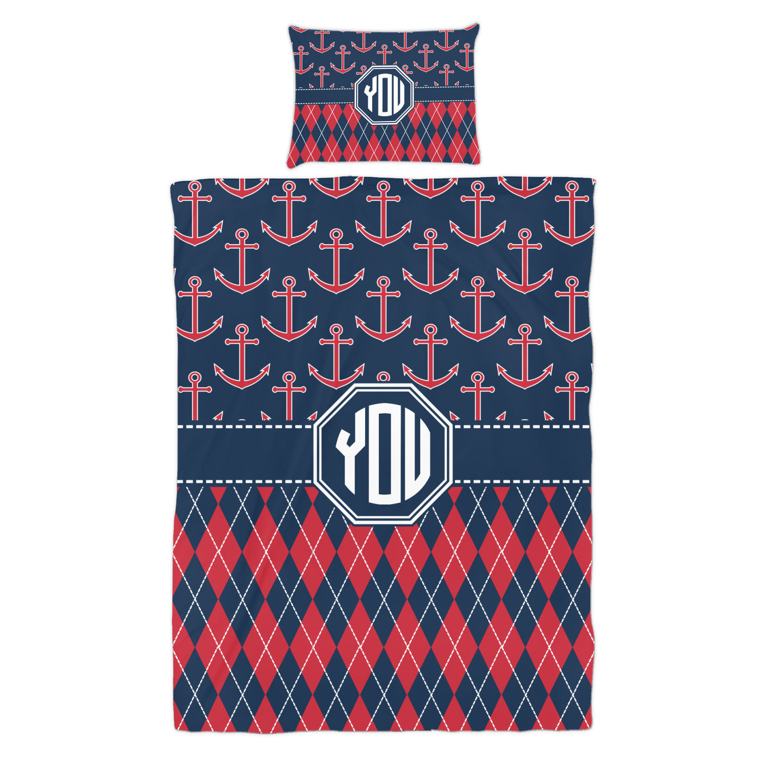 Come sail away with our Anchors & Argyle design. This design is a great balance of sea and land with nautical, red anchors on navy background and preppy red and navy argyle. Our design shown in bold navy and red, but the colors can be customized.
