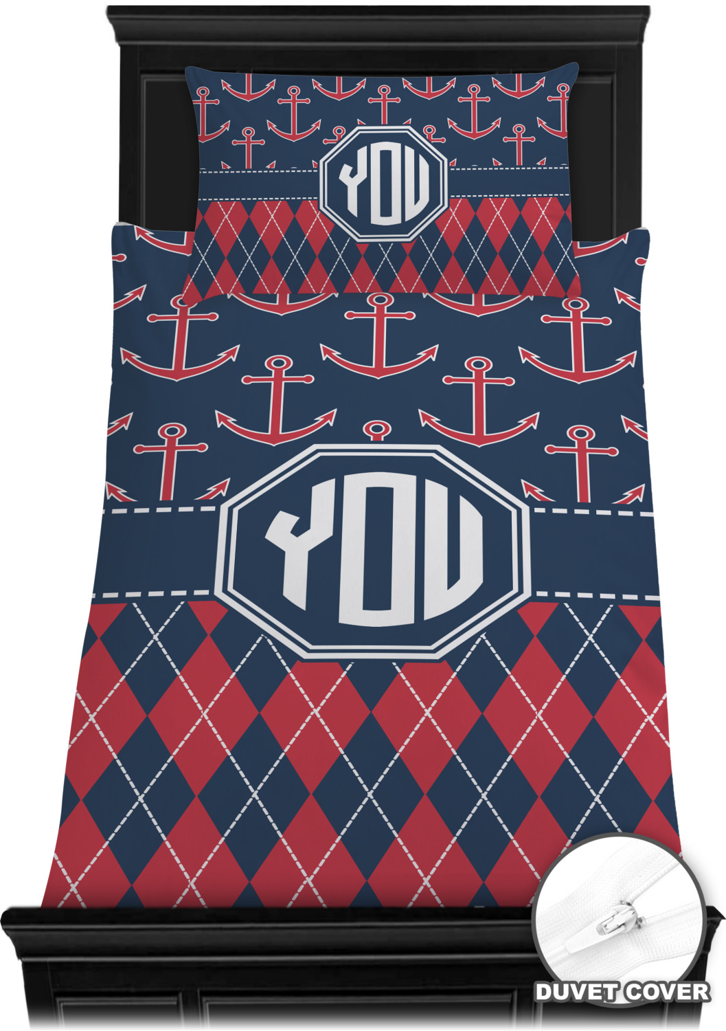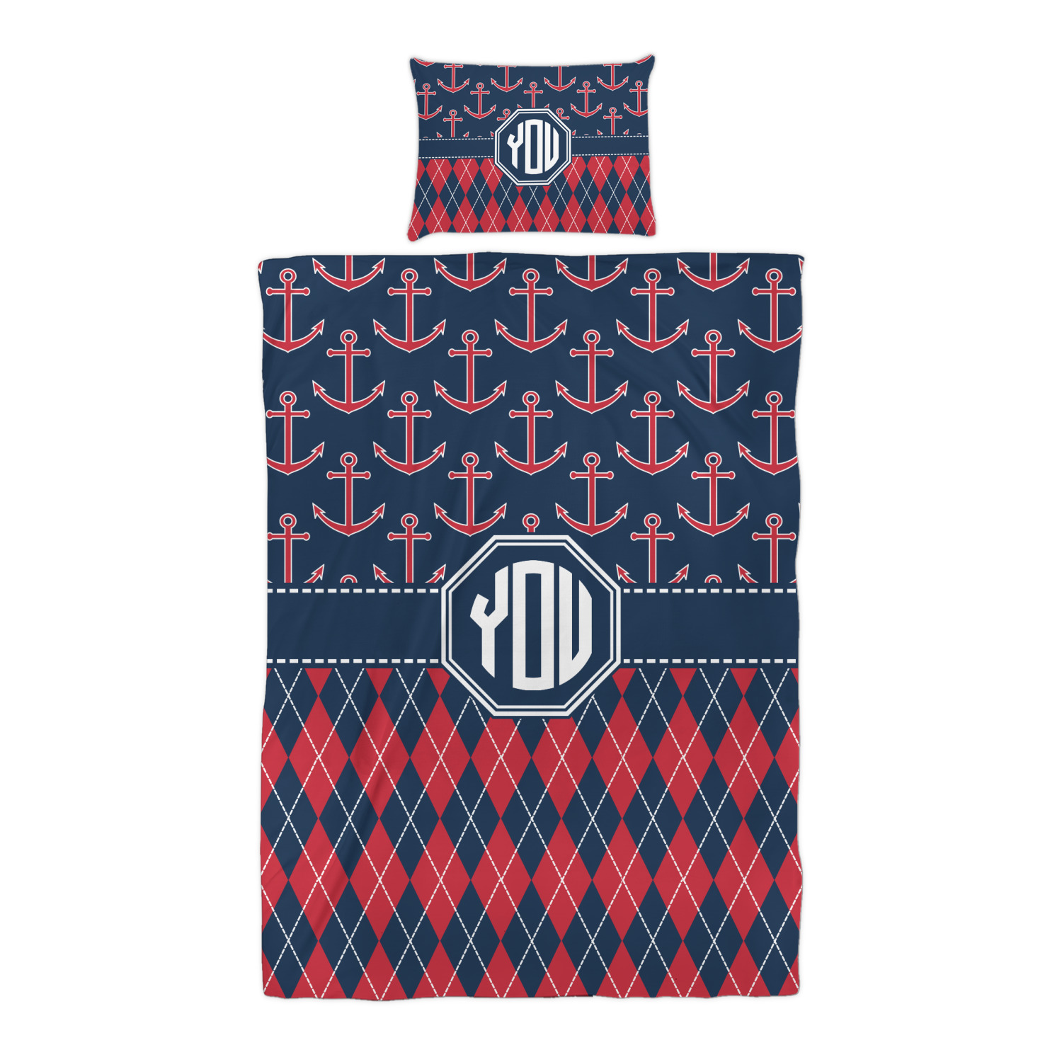 Come sail away with our Anchors & Argyle design. This design is a great balance of sea and land with nautical, red anchors on navy background and preppy red and navy argyle. Our design shown in bold navy and red, but the colors can be customized.