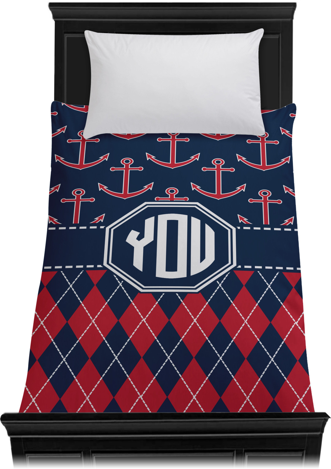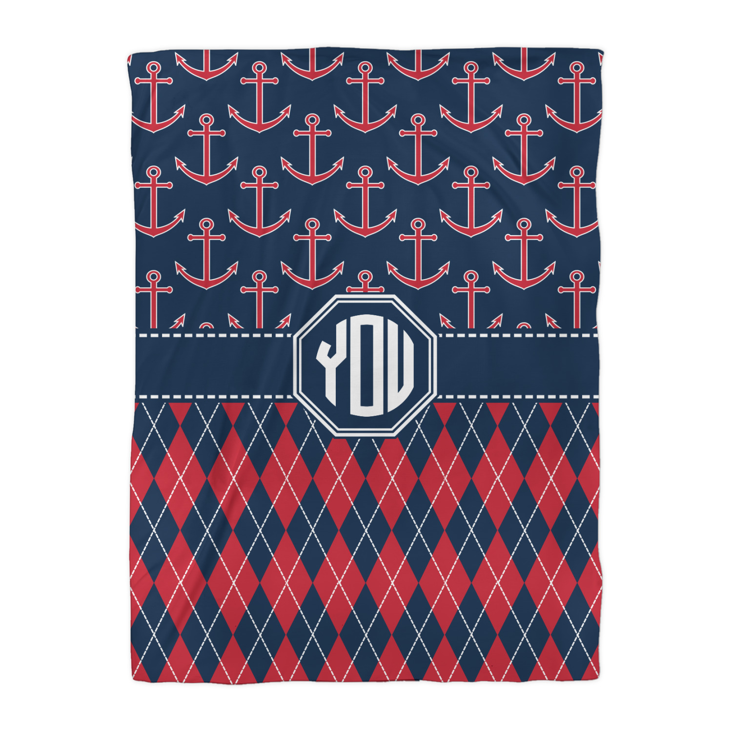 Come sail away with our Anchors & Argyle design. This design is a great balance of sea and land with nautical, red anchors on navy background and preppy red and navy argyle. Our design shown in bold navy and red, but the colors can be customized.