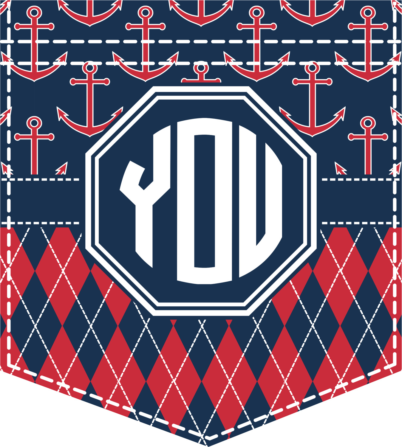 Come sail away with our Anchors & Argyle design. This design is a great balance of sea and land with nautical, red anchors on navy background and preppy red and navy argyle. Our design shown in bold navy and red, but the colors can be customized.