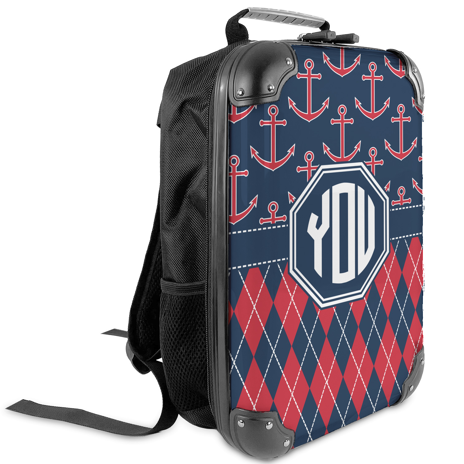 Come sail away with our Anchors & Argyle design. This design is a great balance of sea and land with nautical, red anchors on navy background and preppy red and navy argyle. Our design shown in bold navy and red, but the colors can be customized.