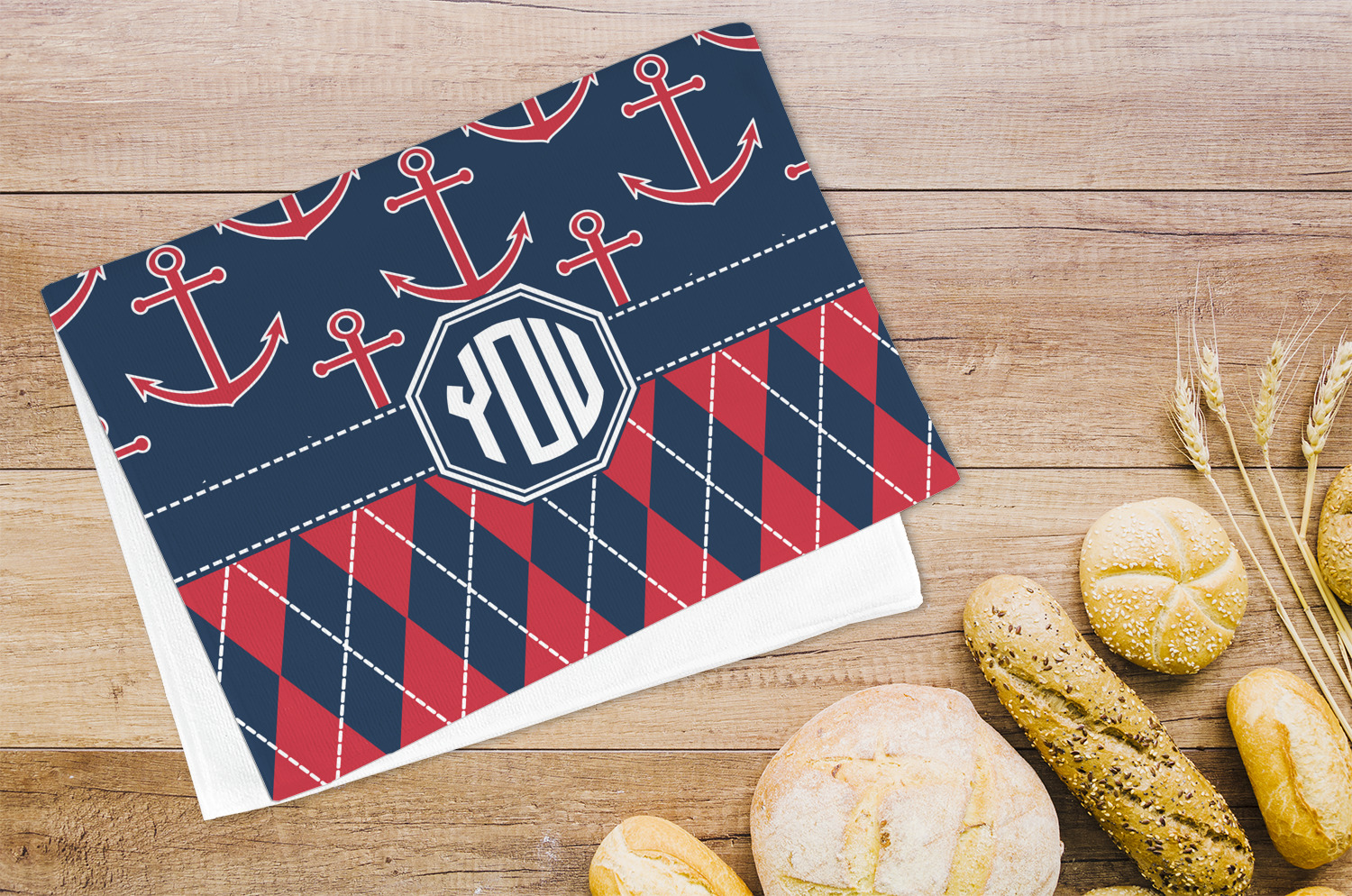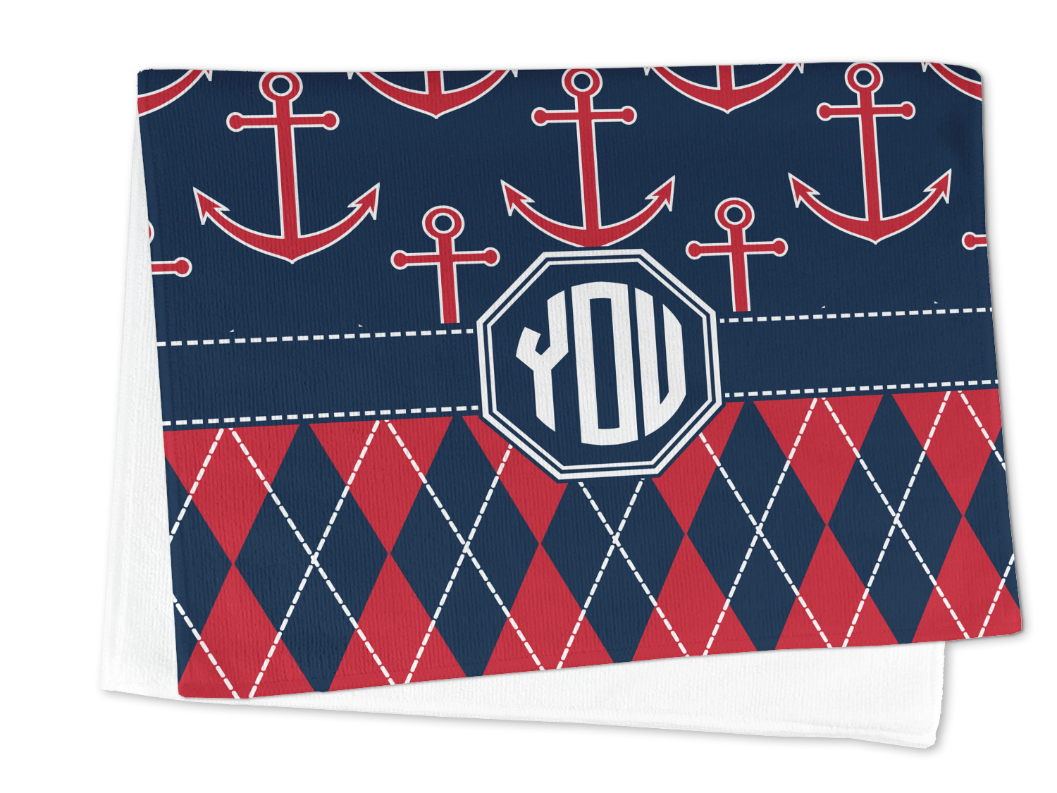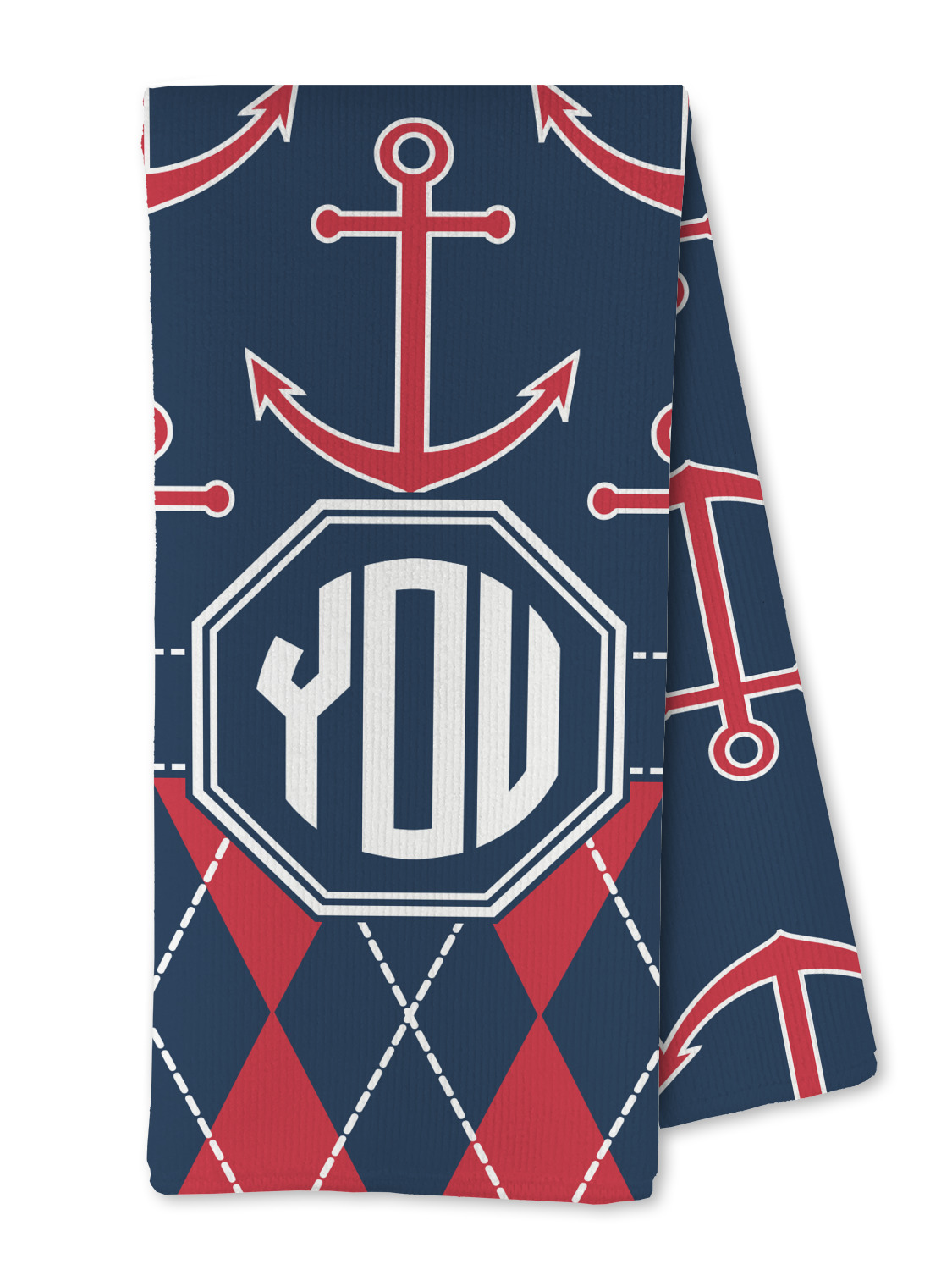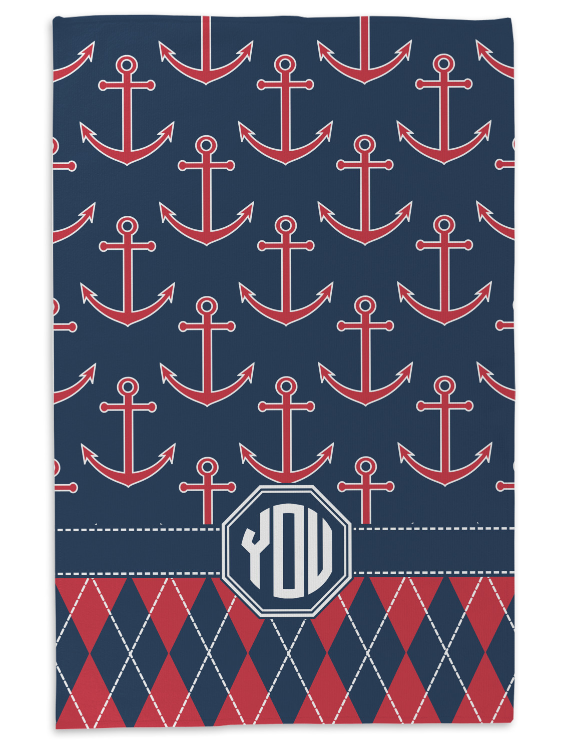 Come sail away with our Anchors & Argyle design. This design is a great balance of sea and land with nautical, red anchors on navy background and preppy red and navy argyle. Our design shown in bold navy and red, but the colors can be customized.