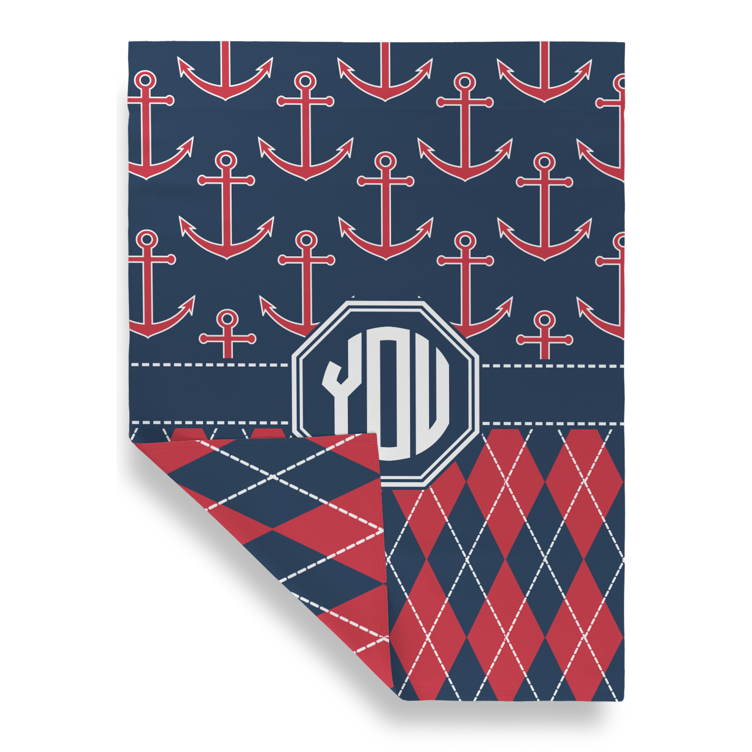 Come sail away with our Anchors & Argyle design. This design is a great balance of sea and land with nautical, red anchors on navy background and preppy red and navy argyle. Our design shown in bold navy and red, but the colors can be customized.
