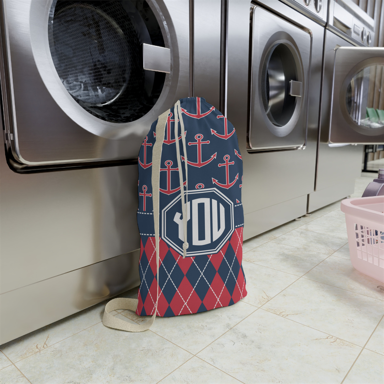 Carry your laundry in style with these customized laundry bags. Available in two sizes, featuring a natural colored woven strap and a cinch cord, these bags hold a lot of clothes or anything else you want to fit in them.