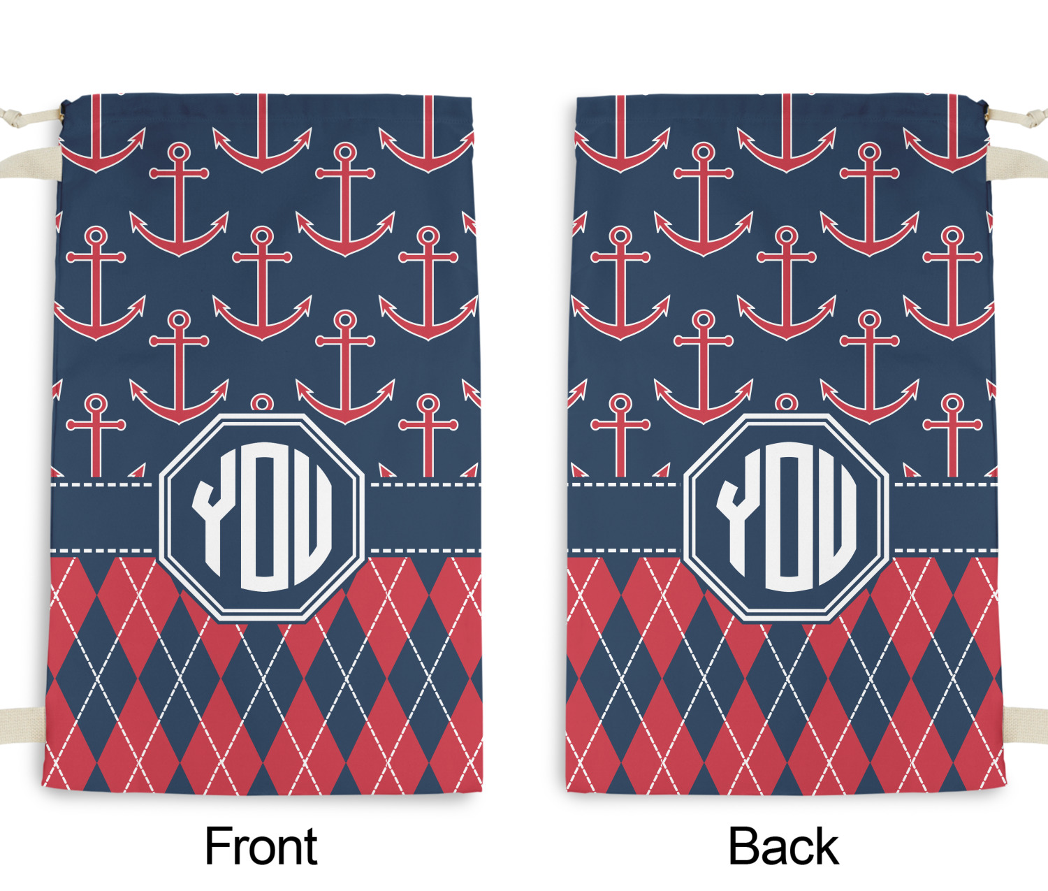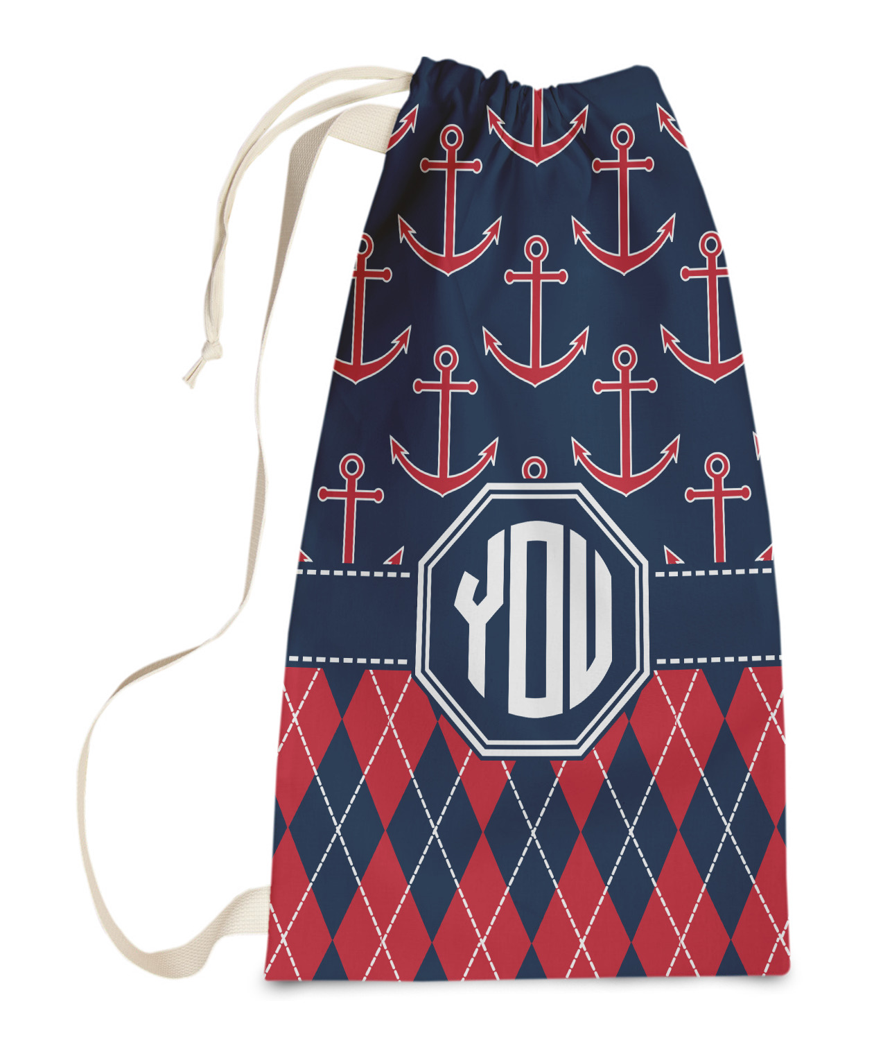 Come sail away with our Anchors & Argyle design. This design is a great balance of sea and land with nautical, red anchors on navy background and preppy red and navy argyle. Our design shown in bold navy and red, but the colors can be customized.