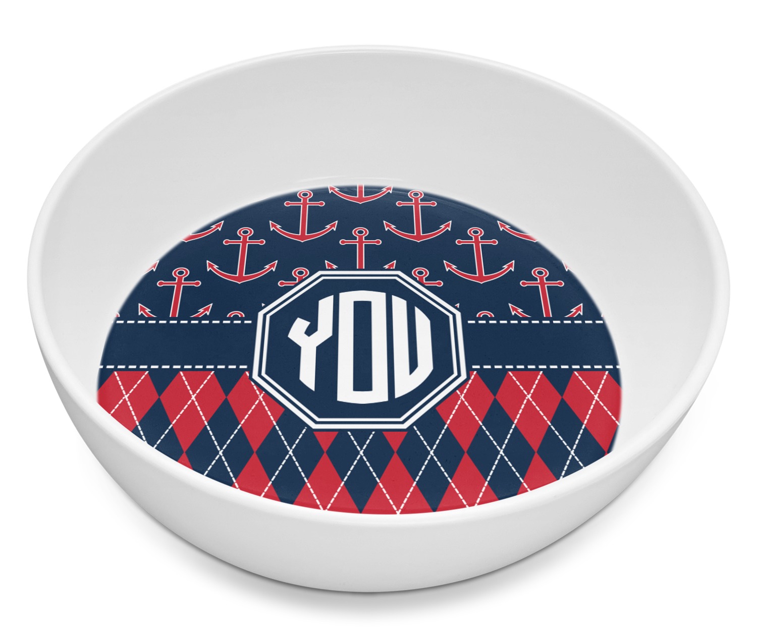 Come sail away with our Anchors & Argyle design. This design is a great balance of sea and land with nautical, red anchors on navy background and preppy red and navy argyle. Our design shown in bold navy and red, but the colors can be customized.