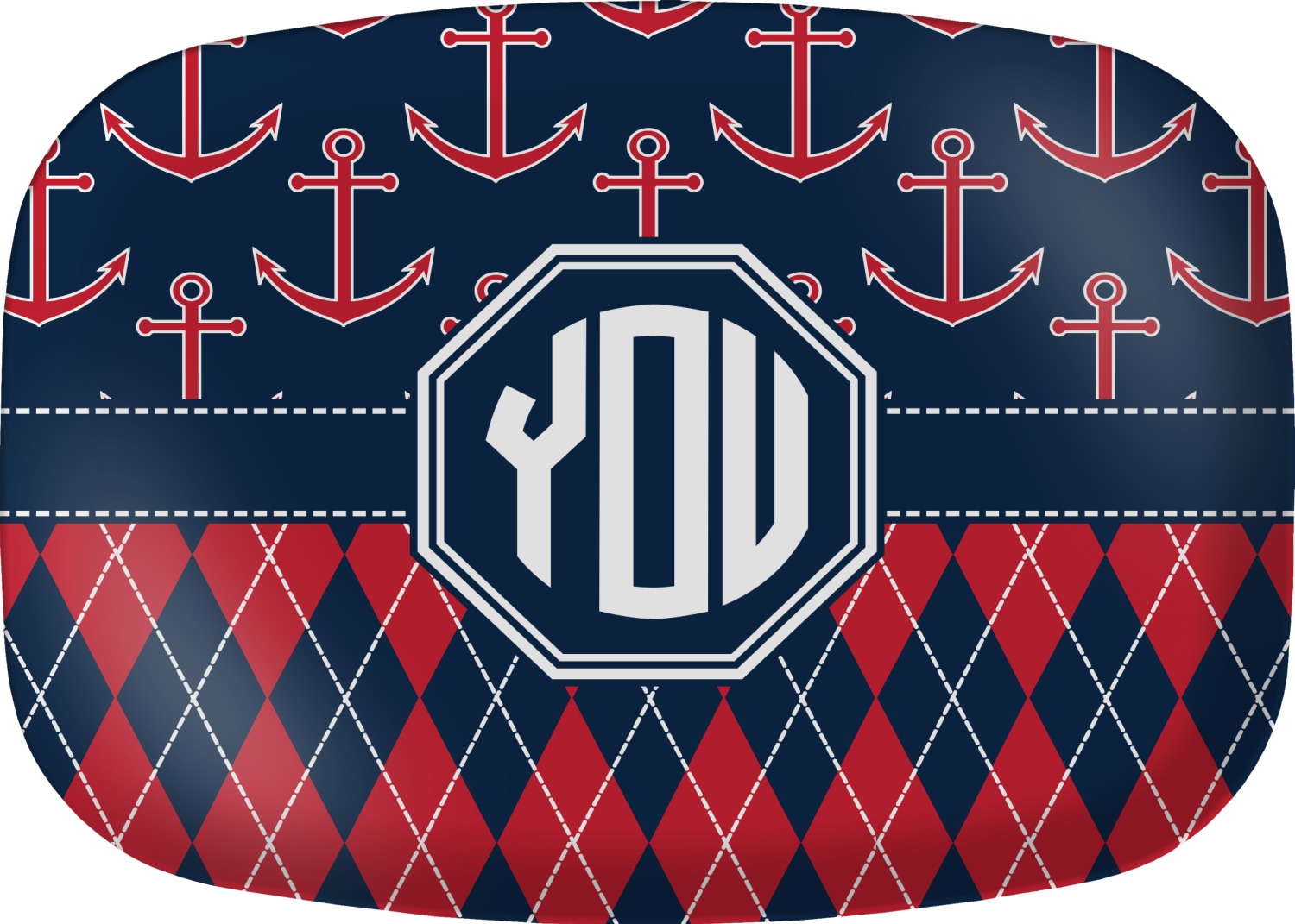 Come sail away with our Anchors & Argyle design. This design is a great balance of sea and land with nautical, red anchors on navy background and preppy red and navy argyle. Our design shown in bold navy and red, but the colors can be customized.