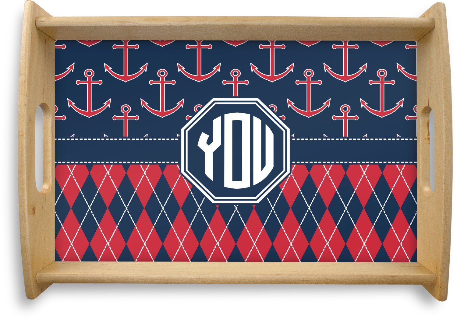 Come sail away with our Anchors & Argyle design. This design is a great balance of sea and land with nautical, red anchors on navy background and preppy red and navy argyle. Our design shown in bold navy and red, but the colors can be customized.