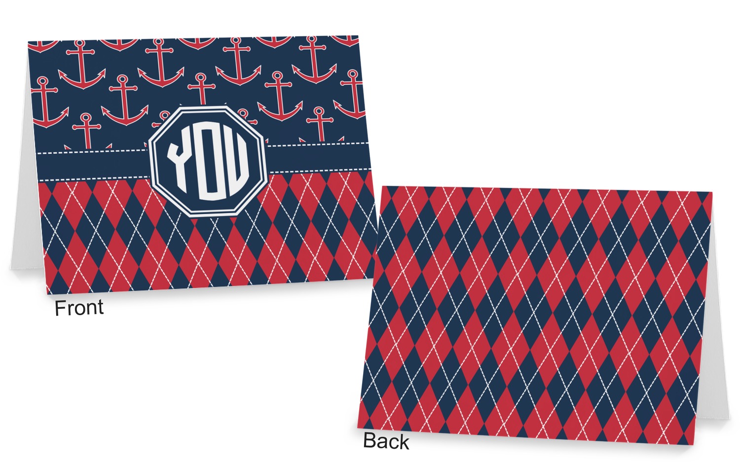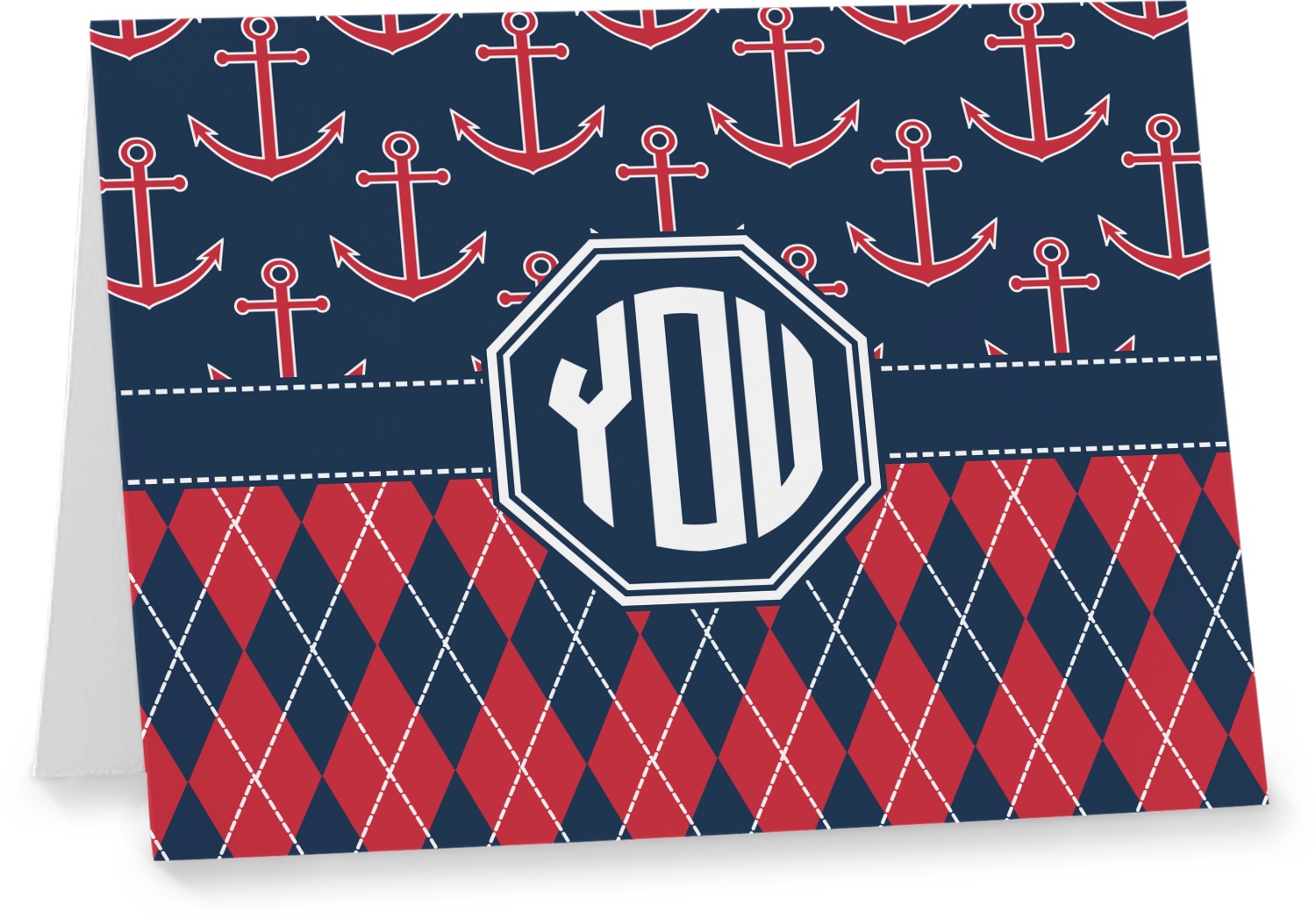 Come sail away with our Anchors & Argyle design. This design is a great balance of sea and land with nautical, red anchors on navy background and preppy red and navy argyle. Our design shown in bold navy and red, but the colors can be customized.