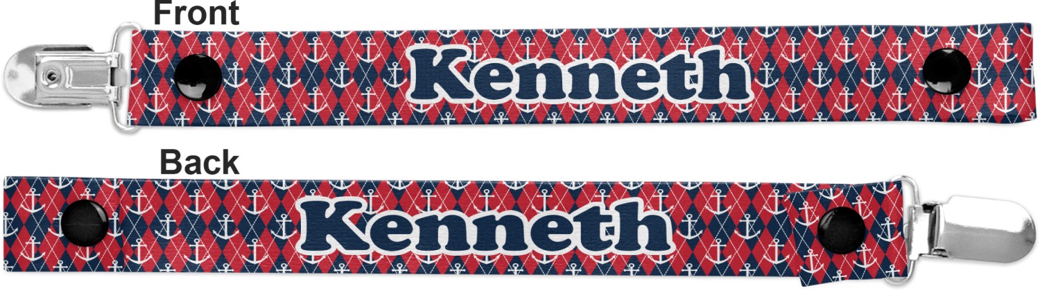 This personalized pacifier clip is the ideal size and measures at approximately 7.5 inches in length, when either end is snapped closed. On one end, you'll find a snap button. This button of your baby's pacifier holder is what can be attached to their pacifier to hold is securely in place. Simply open the snap, slip it through the pacifier opening, and snap it back into place. On the opposite end of this baby pacifier holder, you'll find a metal clip that can secure to a baby's collar or sleeve. This clip ensures that the strap stays in place, and that your baby's pacifier is always on hand.