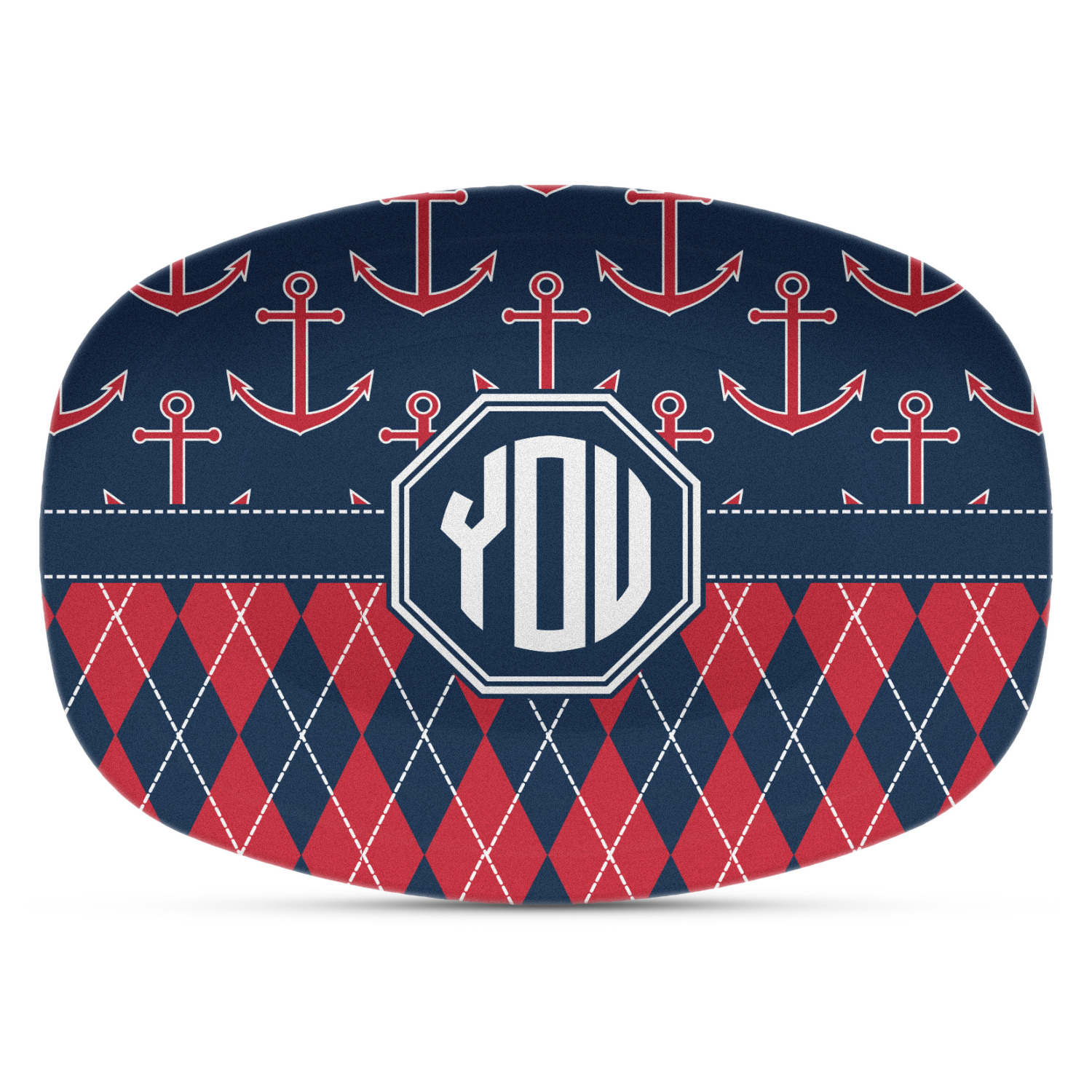 Come sail away with our Anchors & Argyle design. This design is a great balance of sea and land with nautical, red anchors on navy background and preppy red and navy argyle. Our design shown in bold navy and red, but the colors can be customized.