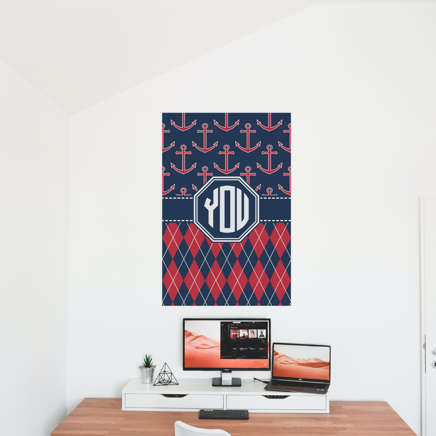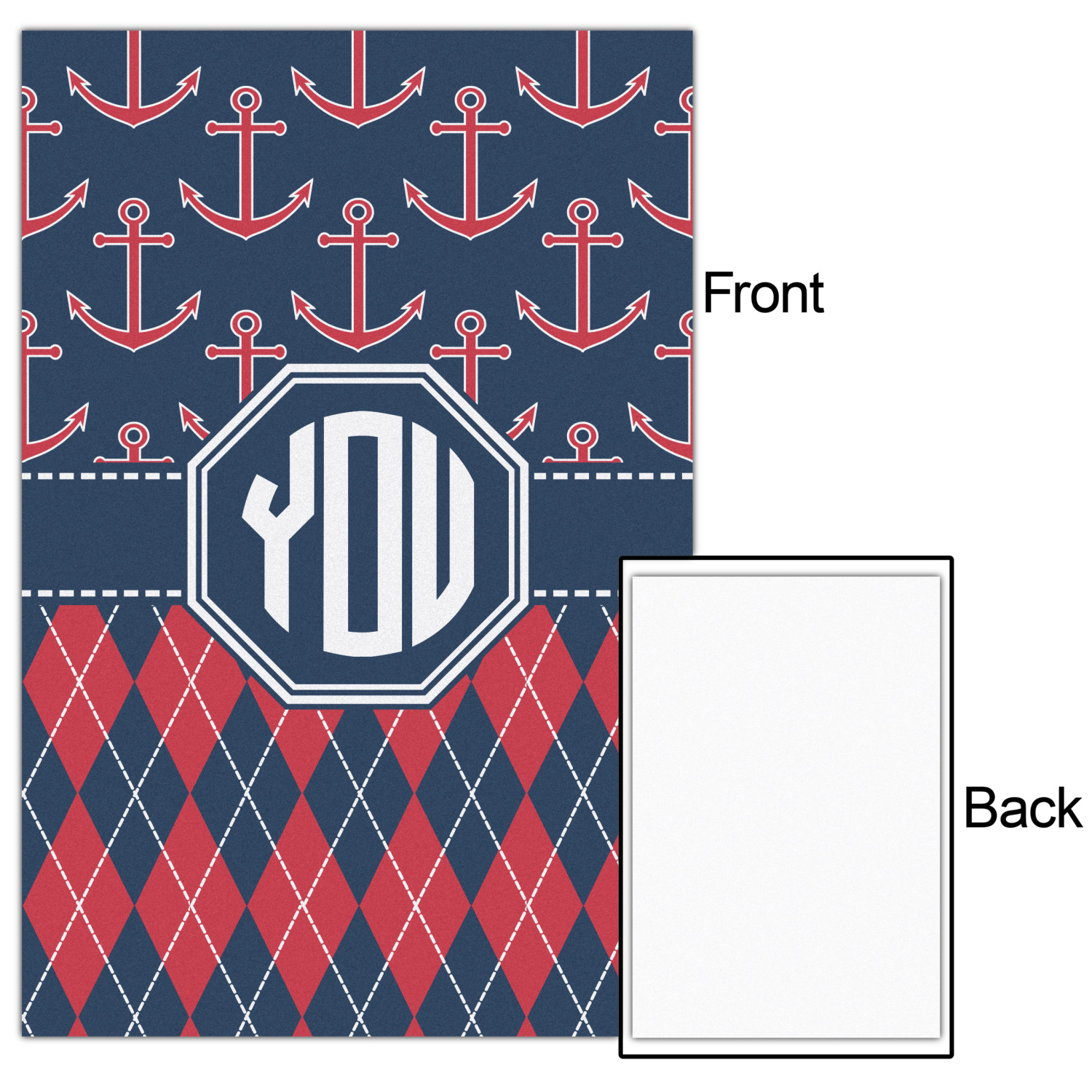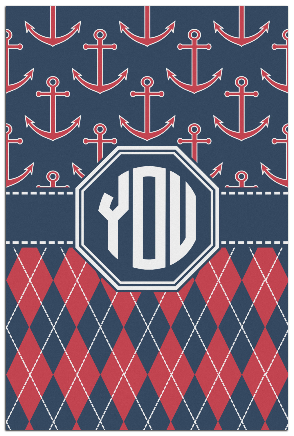 Come sail away with our Anchors & Argyle design. This design is a great balance of sea and land with nautical, red anchors on navy background and preppy red and navy argyle. Our design shown in bold navy and red, but the colors can be customized.