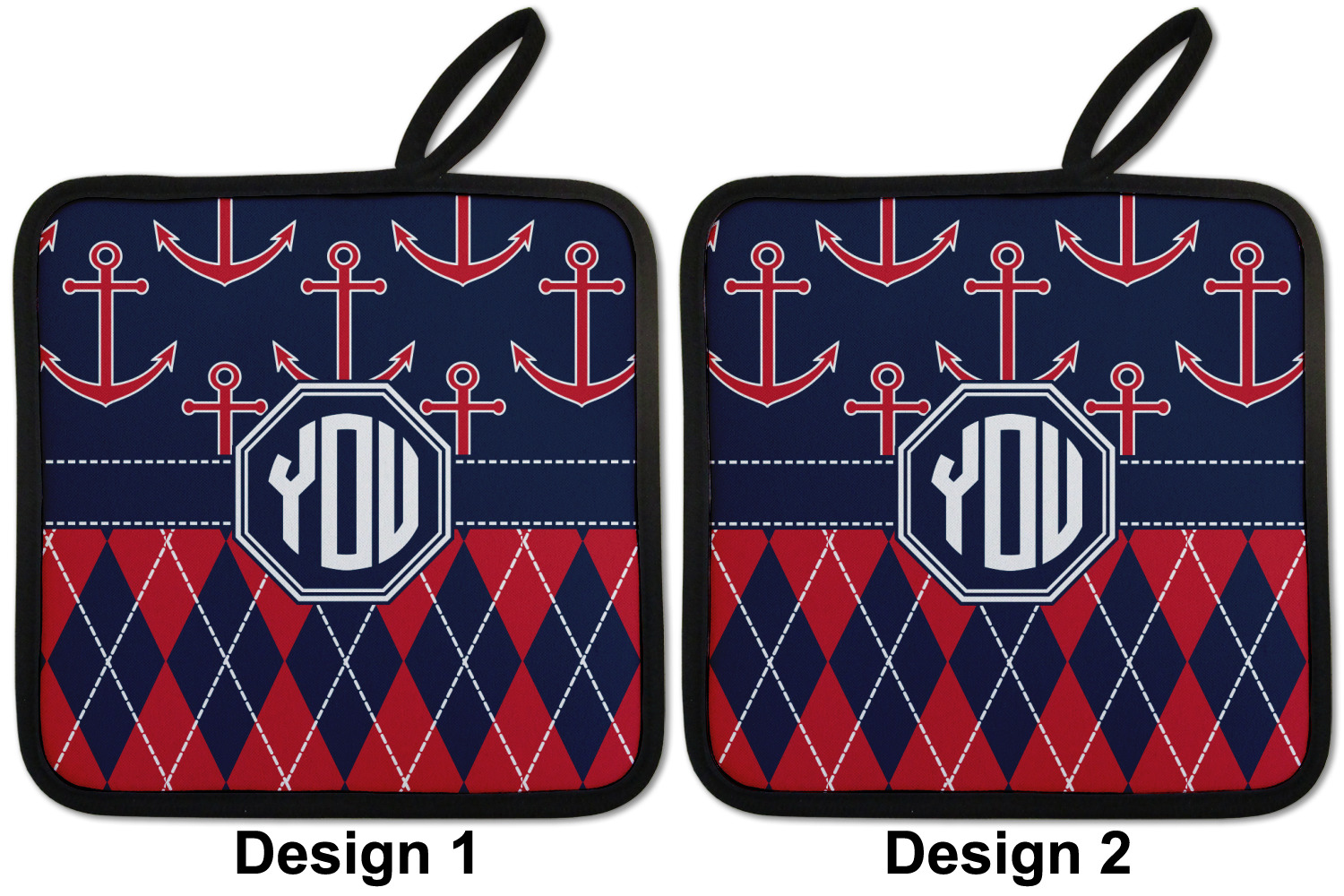 Our personalized pot holders feature a neoprene front that displays your personalization in vibrant colors. The backing of the hot pot holder is rubberized; the textured backing allows you to have a great grip when using this custom pot holder. The two materials are joined with a sleek, black trim, and the holder also includes an attached loop for hanging and storage. The pot holder is approximately 8.75 inches by 8.75 inches and 0.25 inches tall, while the fabric loop is 2.5 inches long. You can purchase a kitchen pot holder by itself or as a set of 2. We also offer a set including one pot holder and one oven mitt.