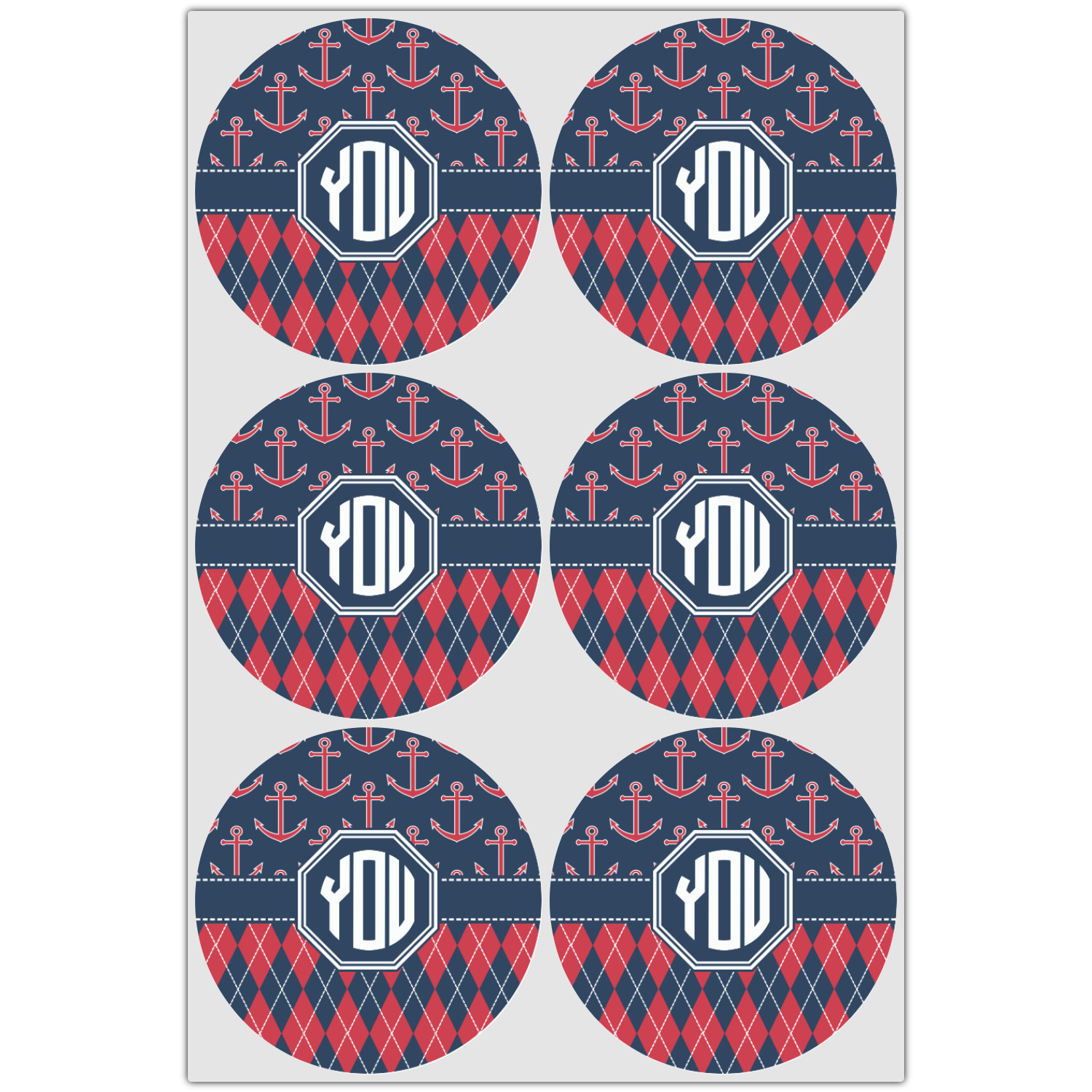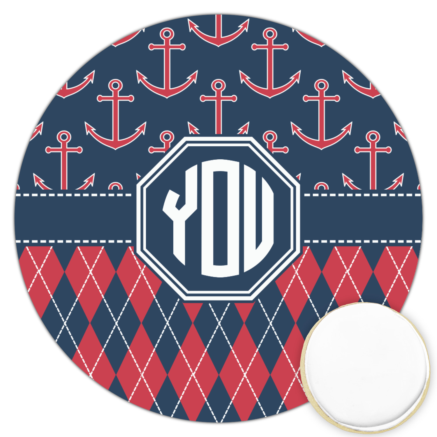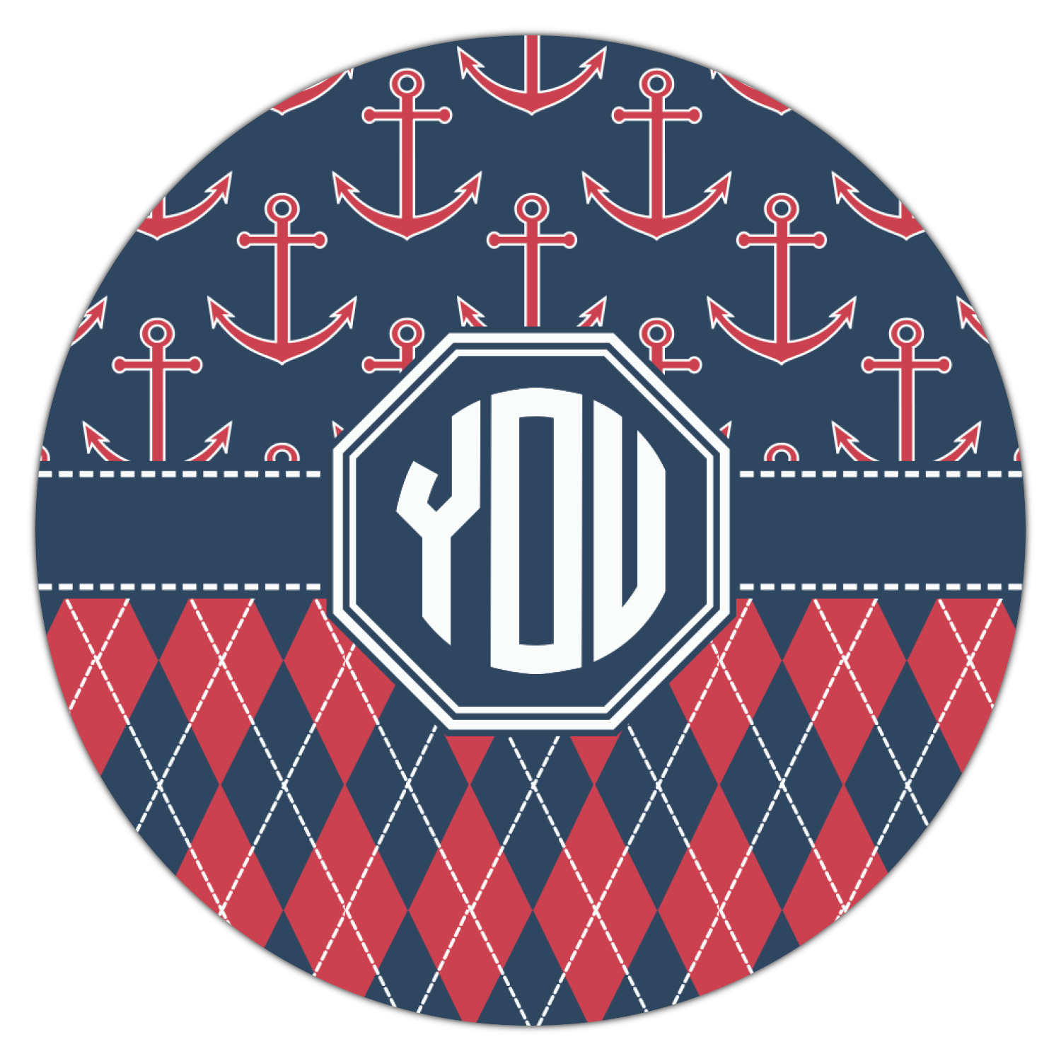 Come sail away with our Anchors & Argyle design. This design is a great balance of sea and land with nautical, red anchors on navy background and preppy red and navy argyle. Our design shown in bold navy and red, but the colors can be customized.