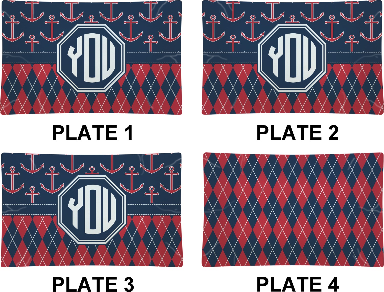 Come sail away with our Anchors & Argyle design. This design is a great balance of sea and land with nautical, red anchors on navy background and preppy red and navy argyle. Our design shown in bold navy and red, but the colors can be customized.