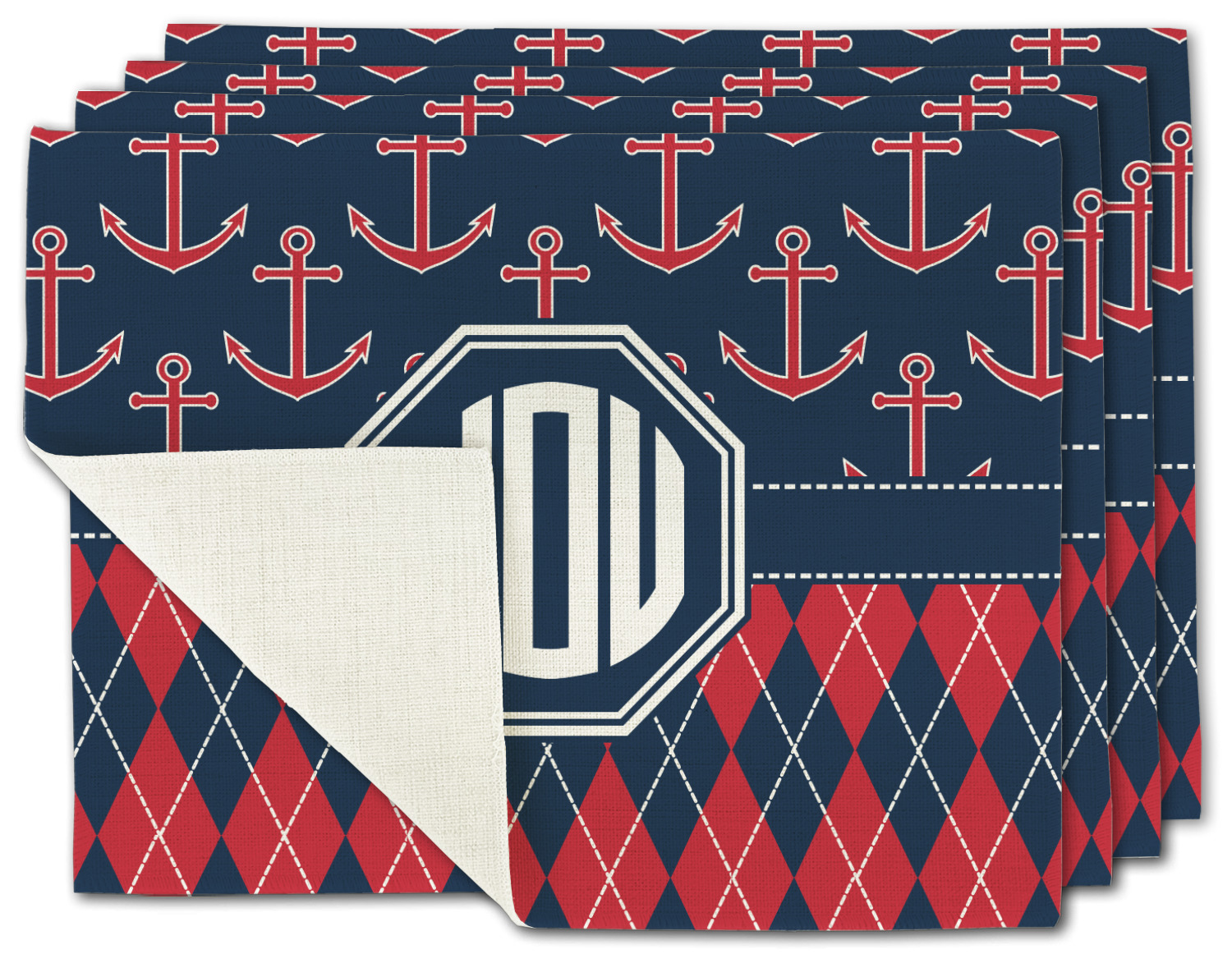 Come sail away with our Anchors & Argyle design. This design is a great balance of sea and land with nautical, red anchors on navy background and preppy red and navy argyle. Our design shown in bold navy and red, but the colors can be customized.