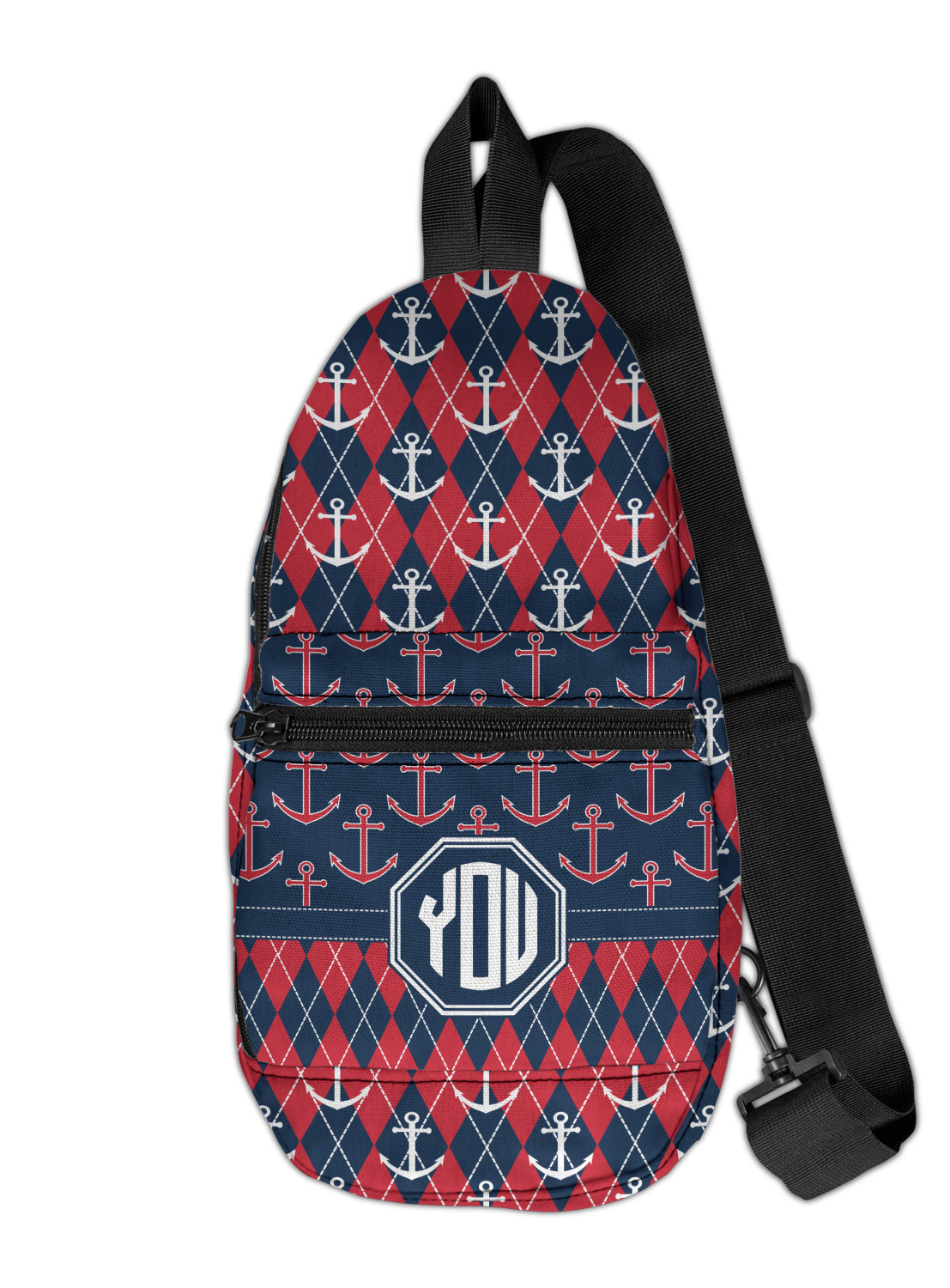Come sail away with our Anchors & Argyle design. This design is a great balance of sea and land with nautical, red anchors on navy background and preppy red and navy argyle. Our design shown in bold navy and red, but the colors can be customized.