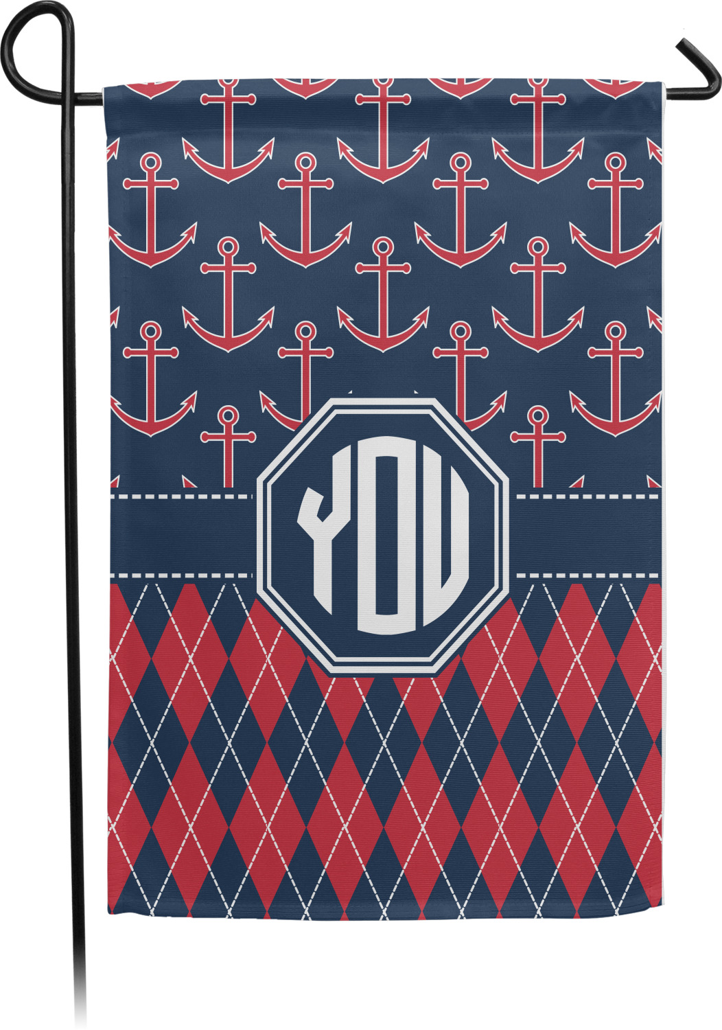 Come sail away with our Anchors & Argyle design. This design is a great balance of sea and land with nautical, red anchors on navy background and preppy red and navy argyle. Our design shown in bold navy and red, but the colors can be customized.