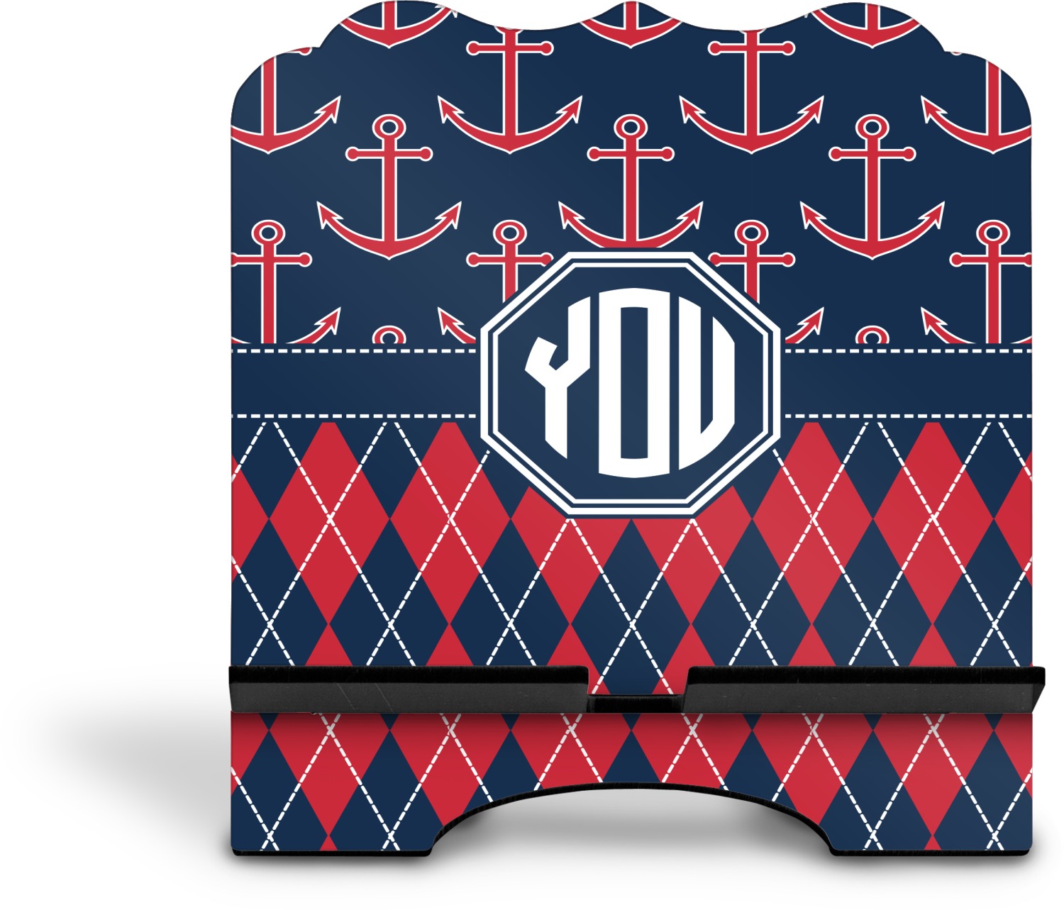 Come sail away with our Anchors & Argyle design. This design is a great balance of sea and land with nautical, red anchors on navy background and preppy red and navy argyle. Our design shown in bold navy and red, but the colors can be customized.