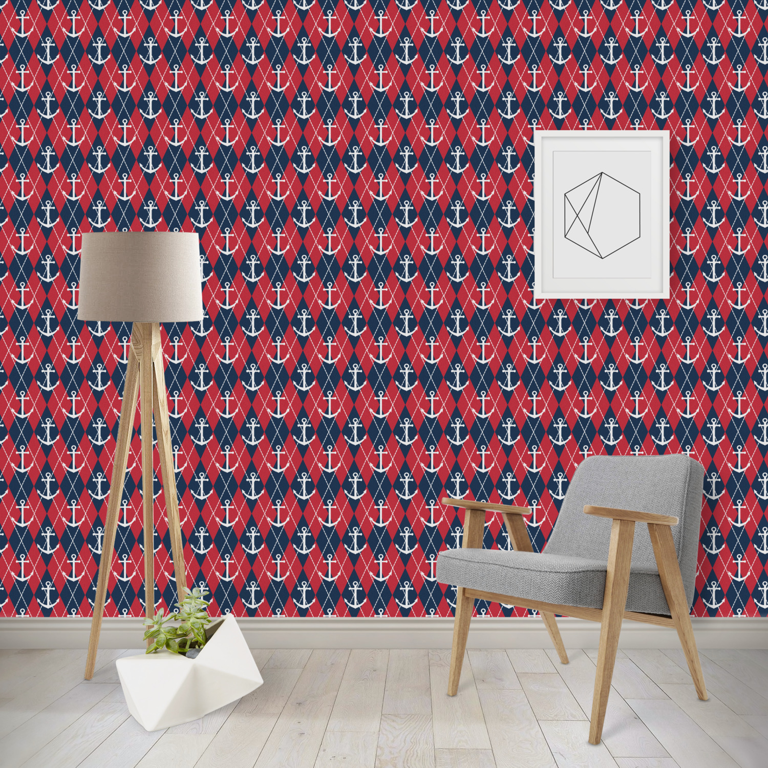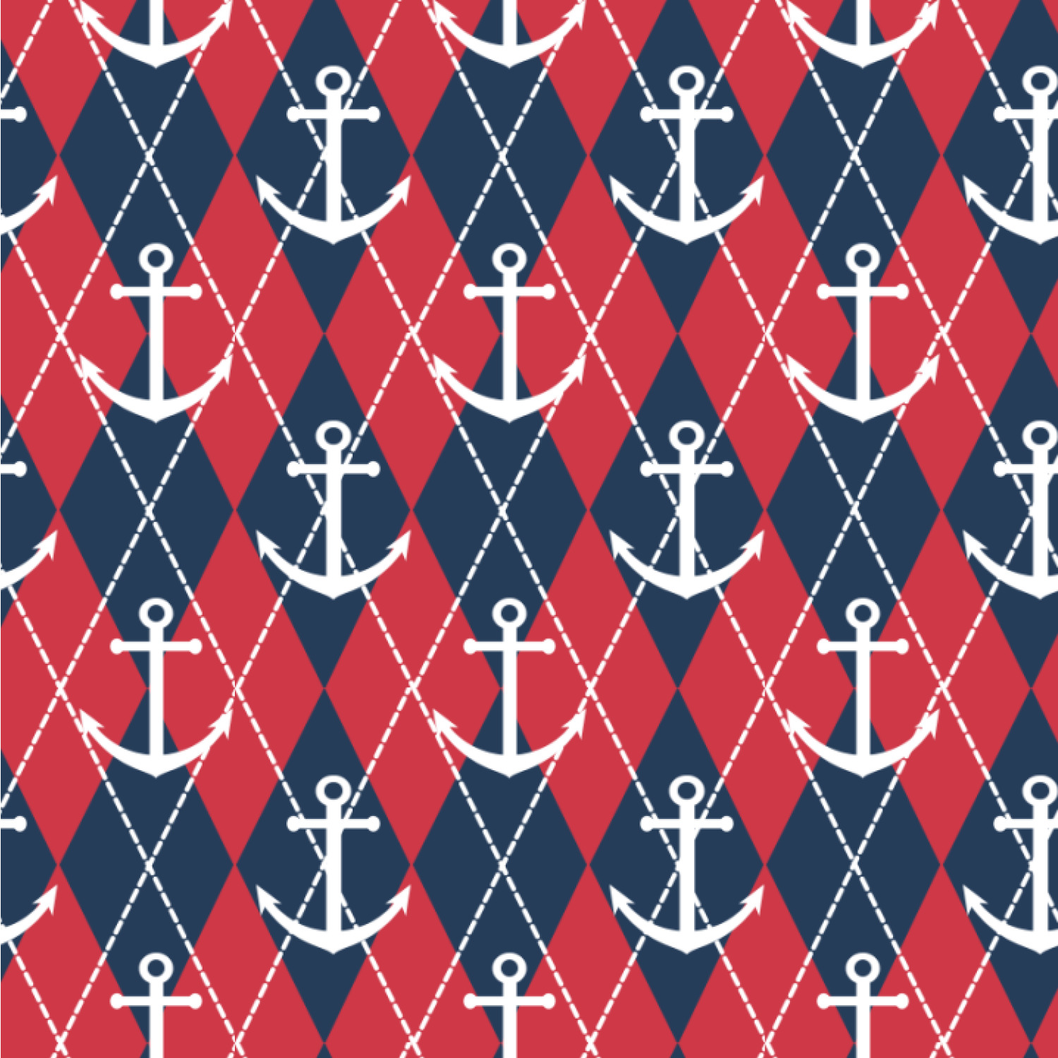 Come sail away with our Anchors & Argyle design. This design is a great balance of sea and land with nautical, red anchors on navy background and preppy red and navy argyle. Our design shown in bold navy and red, but the colors can be customized.