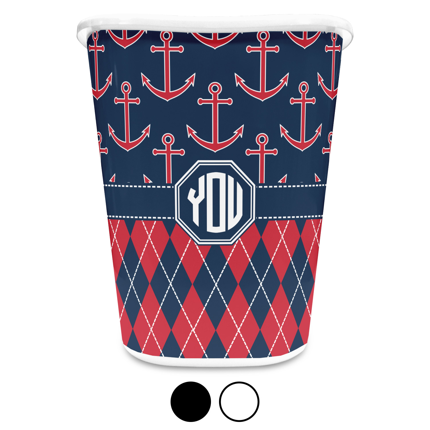Come sail away with our Anchors & Argyle design. This design is a great balance of sea and land with nautical, red anchors on navy background and preppy red and navy argyle. Our design shown in bold navy and red, but the colors can be customized.