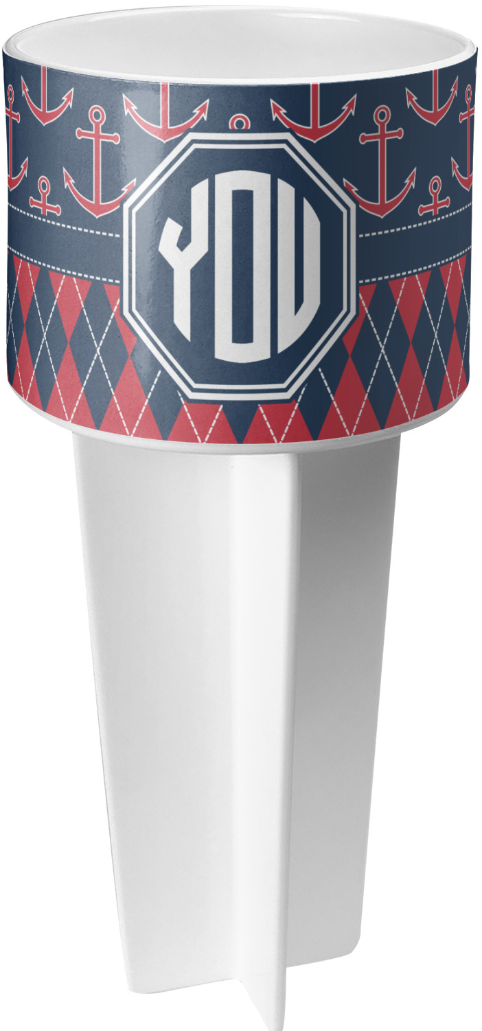 This cup holder has a large stake at its bottom that anchors it to the sand or ground below, while the cup holder rests above the stake. The entire drink holder is made of durable plastic and displays your customization around the cup holder portion. We sell these personalized beach spikers in two different colors: black and white.