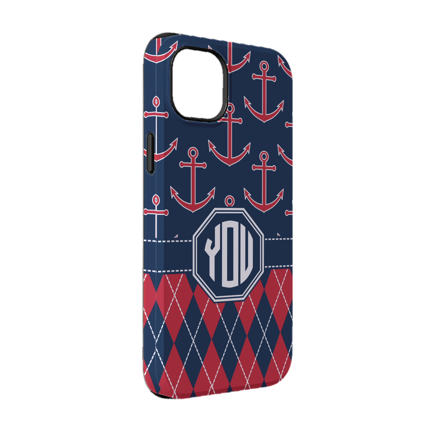 Come sail away with our Anchors & Argyle design. This design is a great balance of sea and land with nautical, red anchors on navy background and preppy red and navy argyle. Our design shown in bold navy and red, but the colors can be customized.