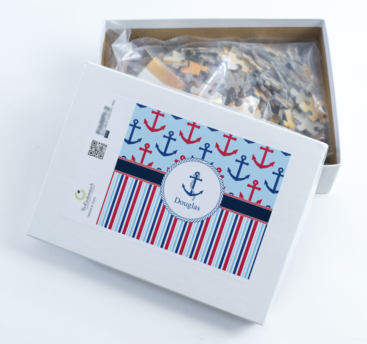 We print our puzzles on thick white chipboard in vibrant colors, then laminate the chipboard and die cut your puzzle. Your jigsaw puzzle is shipped to you in a box with the image of the puzzle on the box.