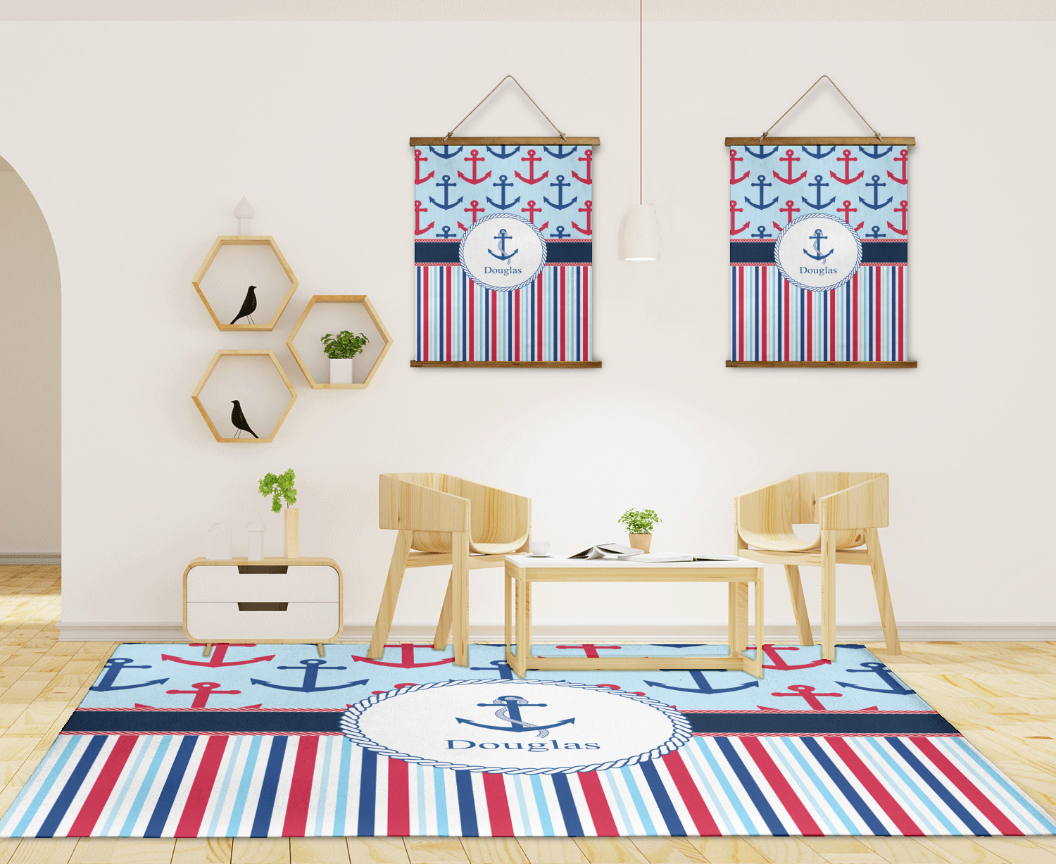 A porthole circle showcases an anchor and rope in the coordinating colors. Add your child's name for that personalized designer's touch.