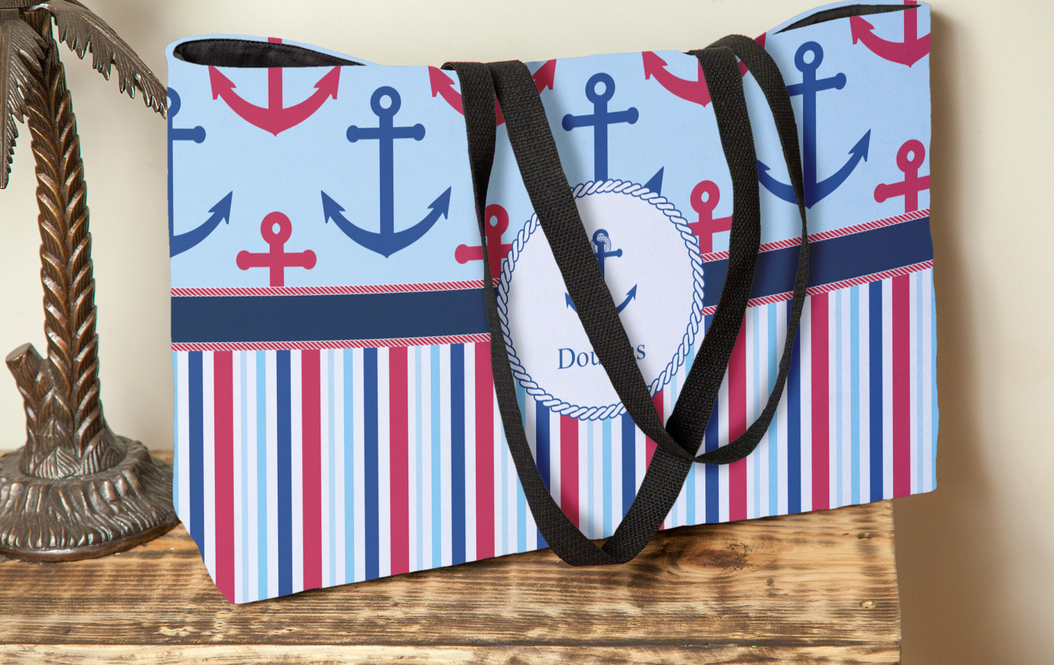 These beach totes are handmade here in the USA. Fabric is printed with your design. The tote is then sewn from the fabric pieces, lining and handles added.