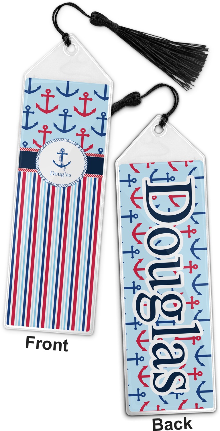 Your personalized bookmark is made of a sturdy, clear vinyl, and is approximately 7.5" x 2.25". We display your personalization on vinyl inserts that are placed on both sides. Accompanying each book marker is a black, fringe tassel that attaches to the reinforced, triangular header.