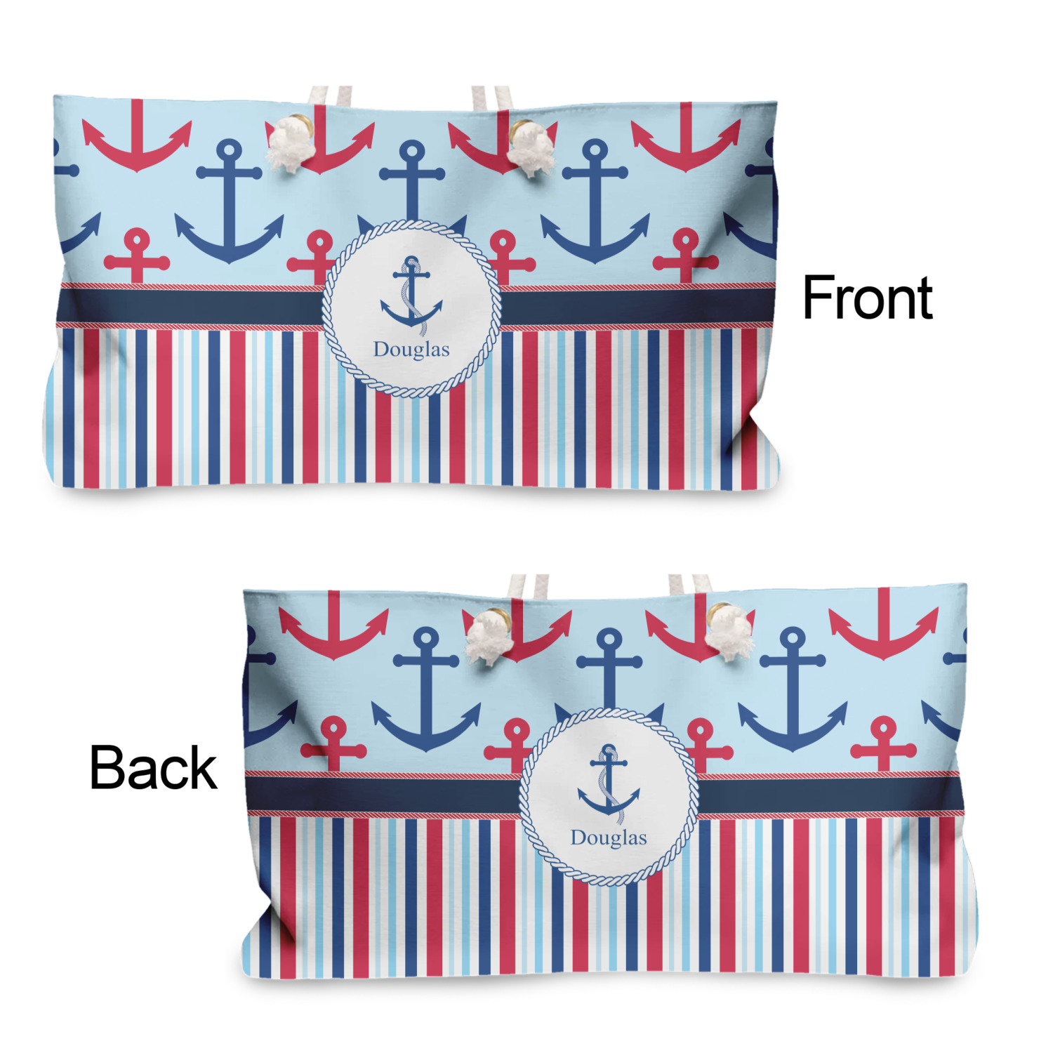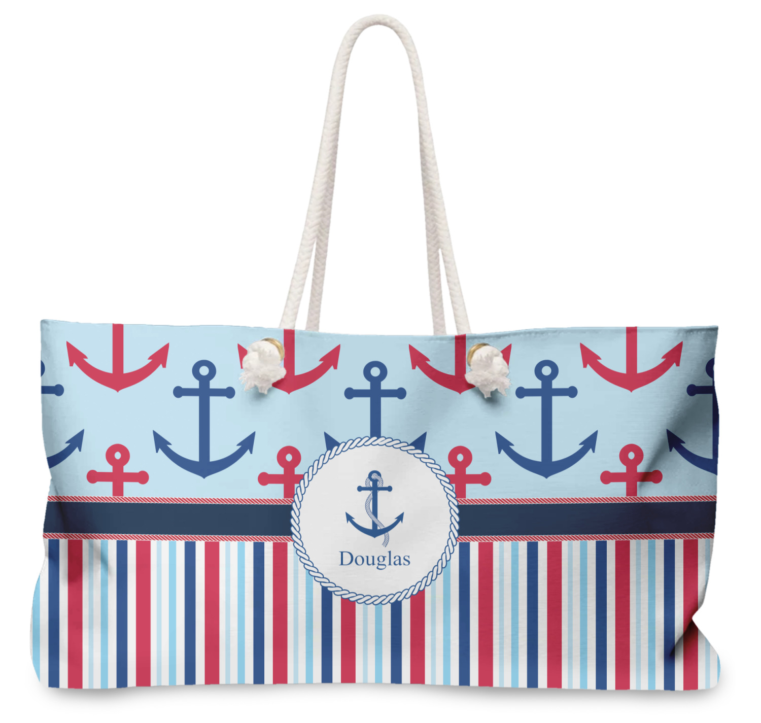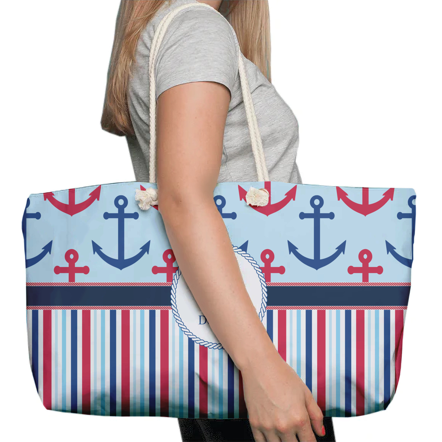 Our oversized weekender tote with rope handles is perfect for your weekend at the beach or on the town. This large tote are 24" W X 13" H, with a 5" gusset and a 27" thick rope handles with a knot that is put through a grommeted brass hole.