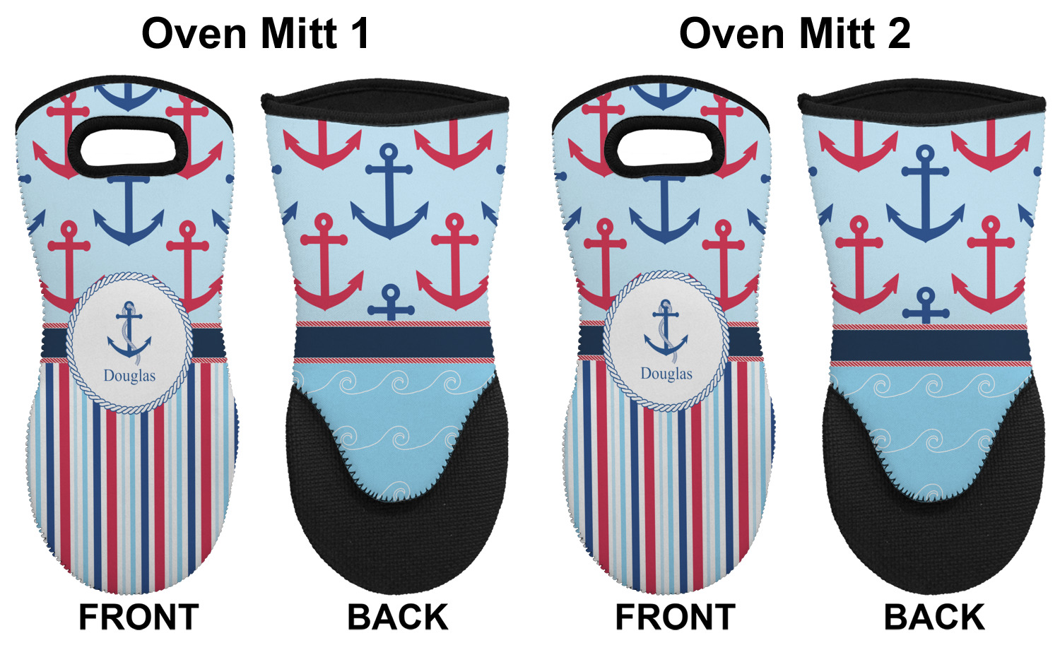 These heat resistant gloves are made entirely of a durable neoprene; the front features a softer texture, while the palm's side has a textured surface, meant to handle heat up to 500 degrees Fahrenheit. Thick, heavy duty stitching connects the two sides. A small, oval cutout appears on the front, and can be used to hang and store the mitt. Your personalization appears on the front, and the upper part of the back of the mitt. The style of these oven mitts are suitable for both the right and left hand, depending on your needs. If you need one for each hand, be sure to order two!