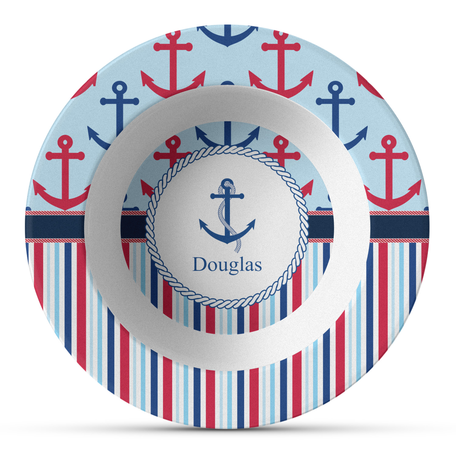 A porthole circle showcases an anchor and rope in the coordinating colors. Add your child's name for that personalized designer's touch.