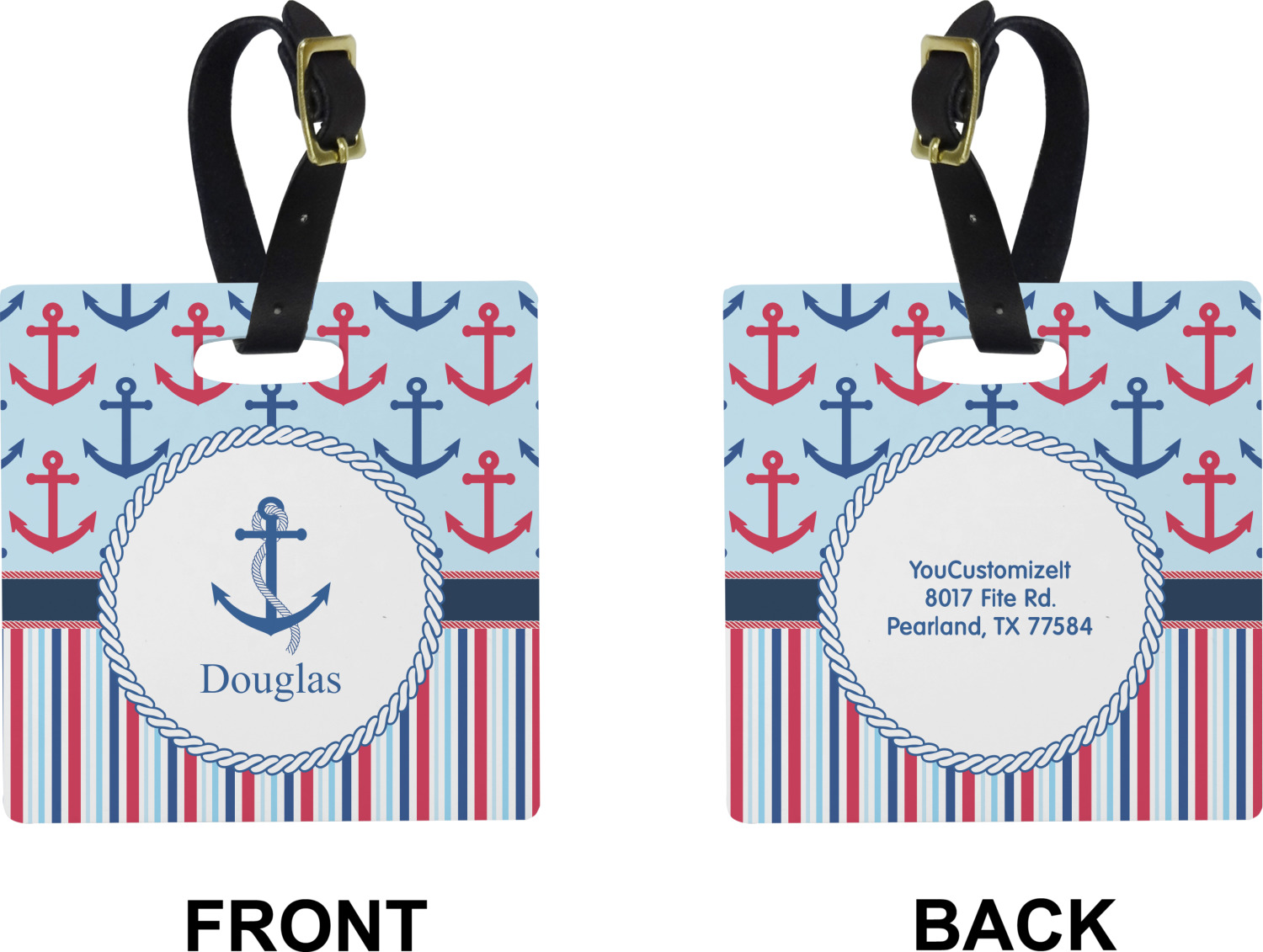 These personalized bag tags are sold in a variety of shapes, so that you may find the product that meets your vision exactly. We sell a round luggage tag, which measures at approximately 4" x 4". Our square luggage tag is about 3.5" x 3.5", while our rectangular version is 2.75" x 4 ".