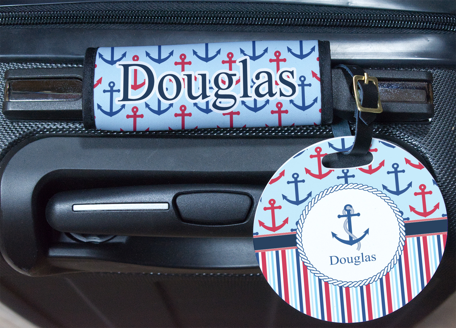 A porthole circle showcases an anchor and rope in the coordinating colors. Add your child's name for that personalized designer's touch.