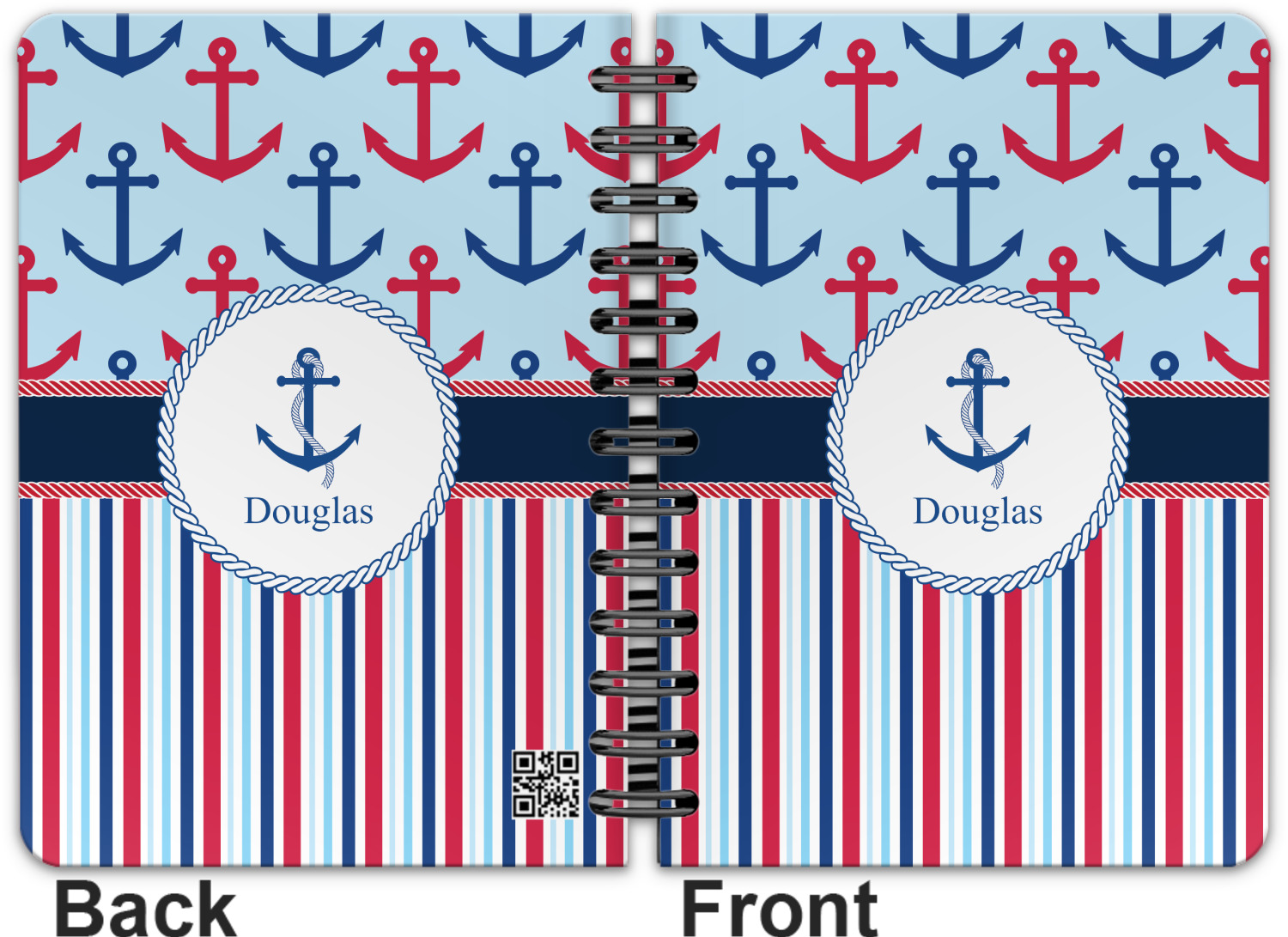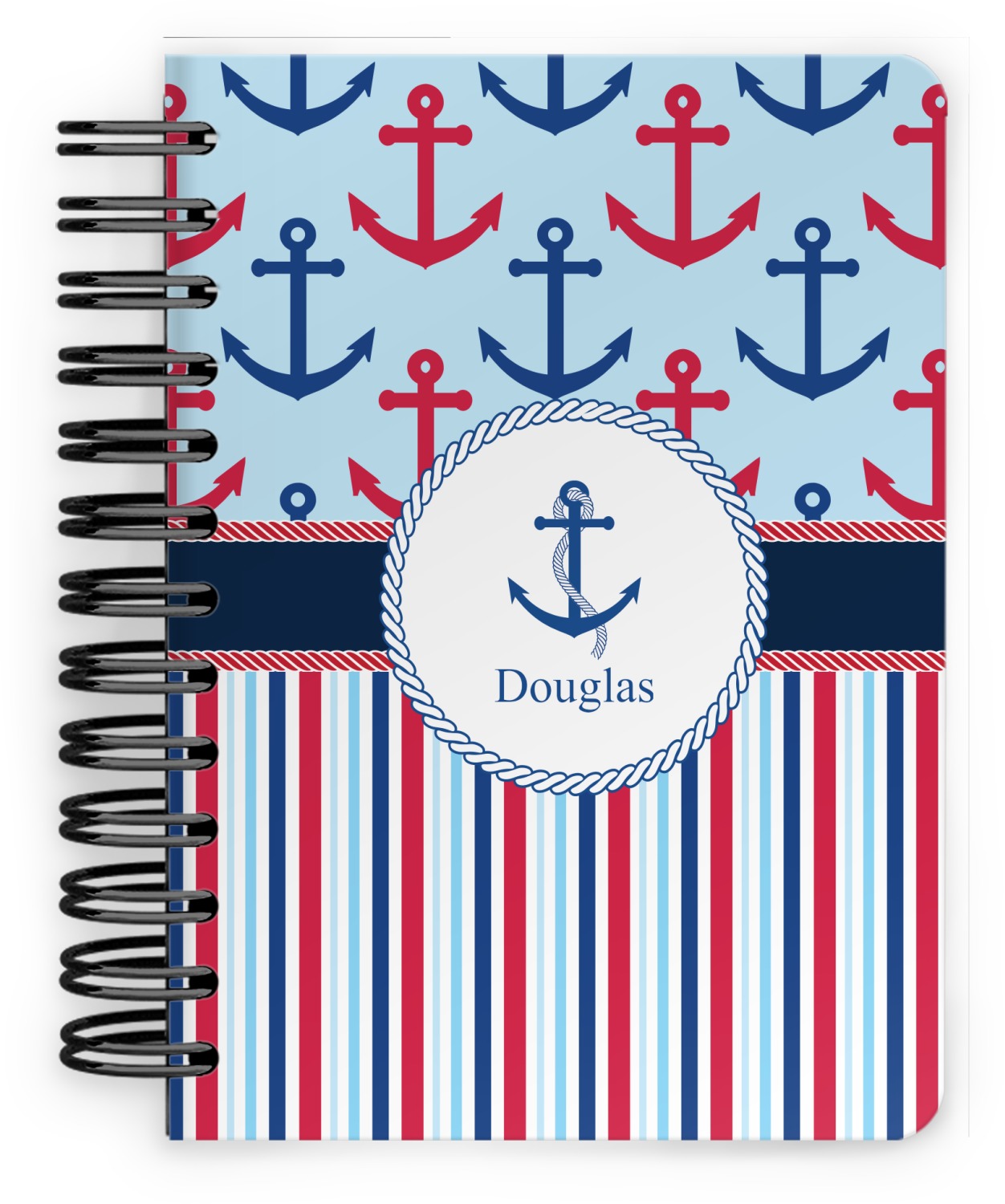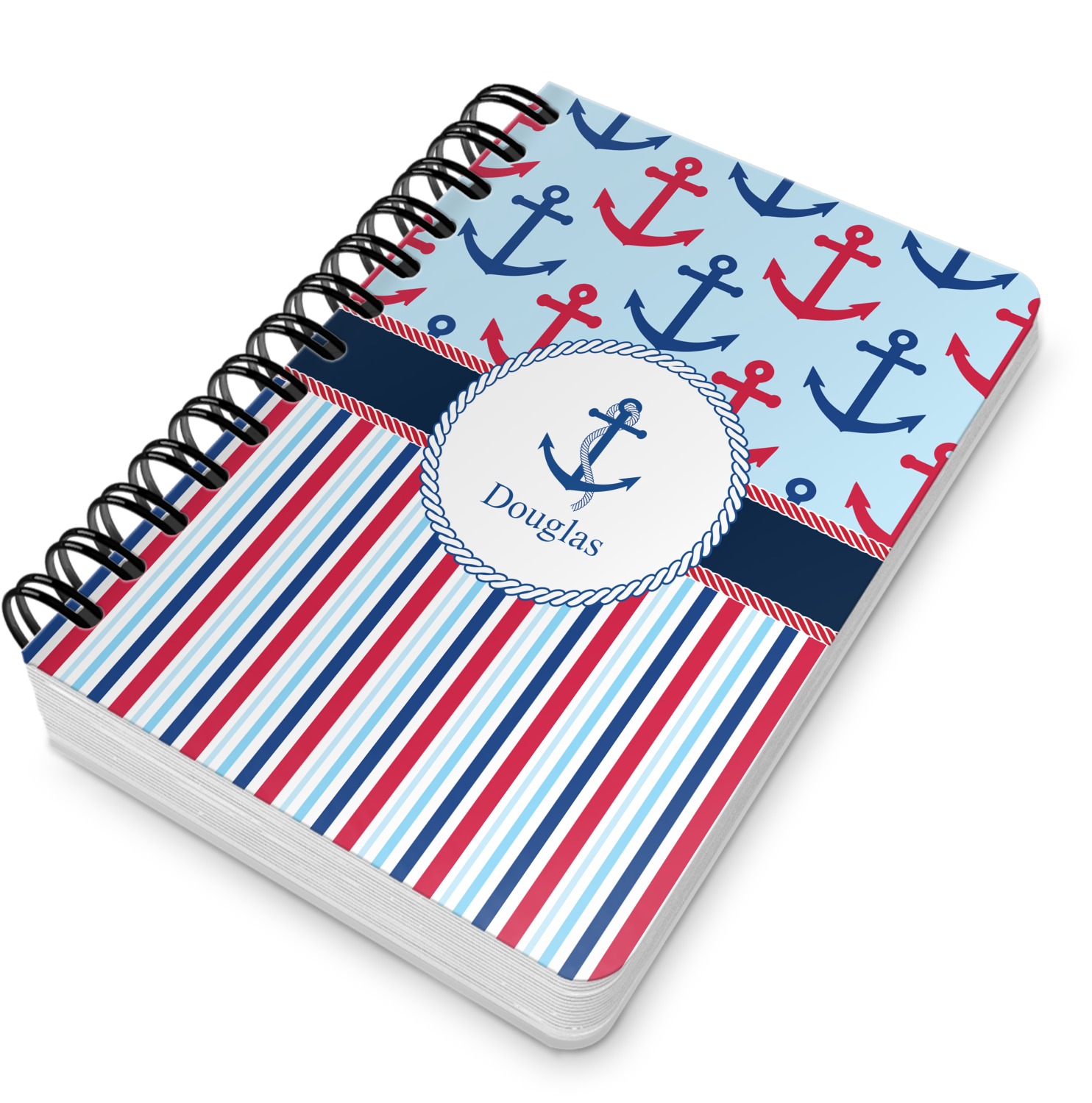 This spiral notebook includes 75 sheets of thick, ruled paper. The front and back of this custom notebook is made of a robust, laminate, plastic covering. We print your personalization on these two panels, underneath a glossy finish, which emphasizes the colors of your design. The two panels and the sheets of paper are held together by a sturdy, black coil. The paper within your bound notebook is perforated for easy, clean tearing.